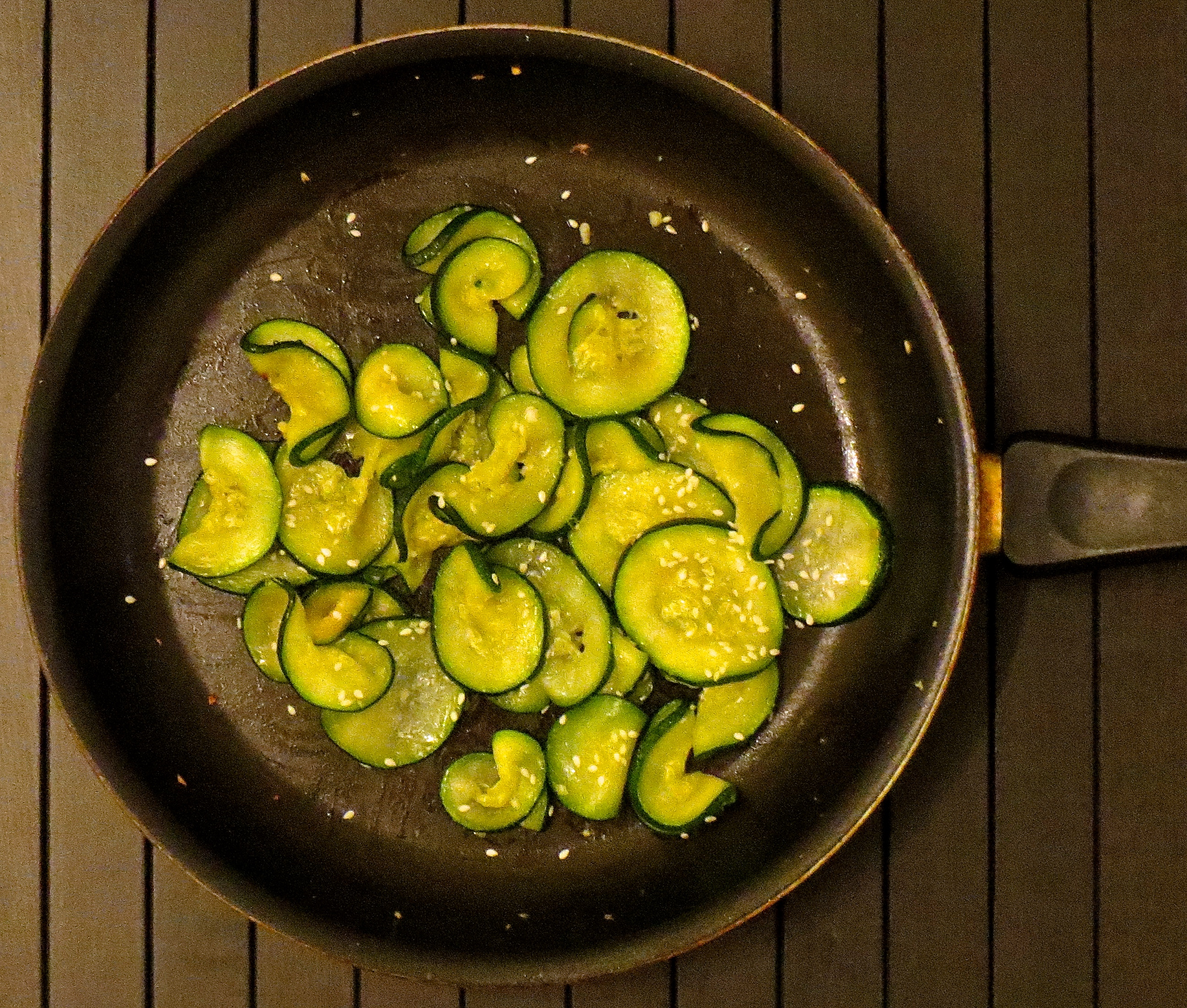 Pese ja halkaise kesäkurpitsa pituussuunnassa. Vuole kuorimaveitsellä kurpitsasta pitkiä suikaleita. Paista suikaleita öljyssä muutaman minuutin ajan, jotta ne kuullottuvat ja pehmenevät. Mausta suolalla ja pippurilla ja ripottele pinnalle vielä seesaminsiemeniä.