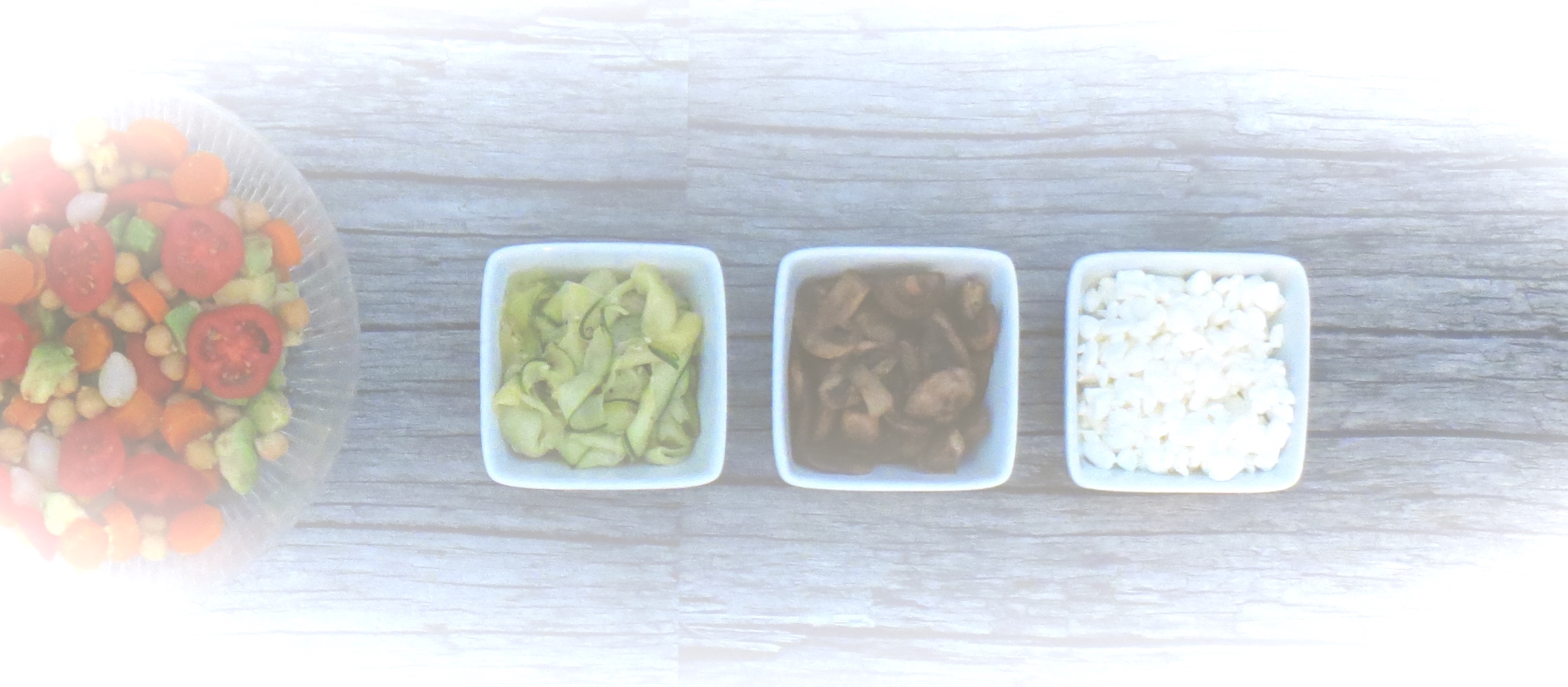 Tarjoile kesäkurpitsaa ja sieniä salaatin lämpiminä kumppaneina, asettele ne tarjolle erikseen. Voit lisätä tarjoiluun vielä raejuustoa.