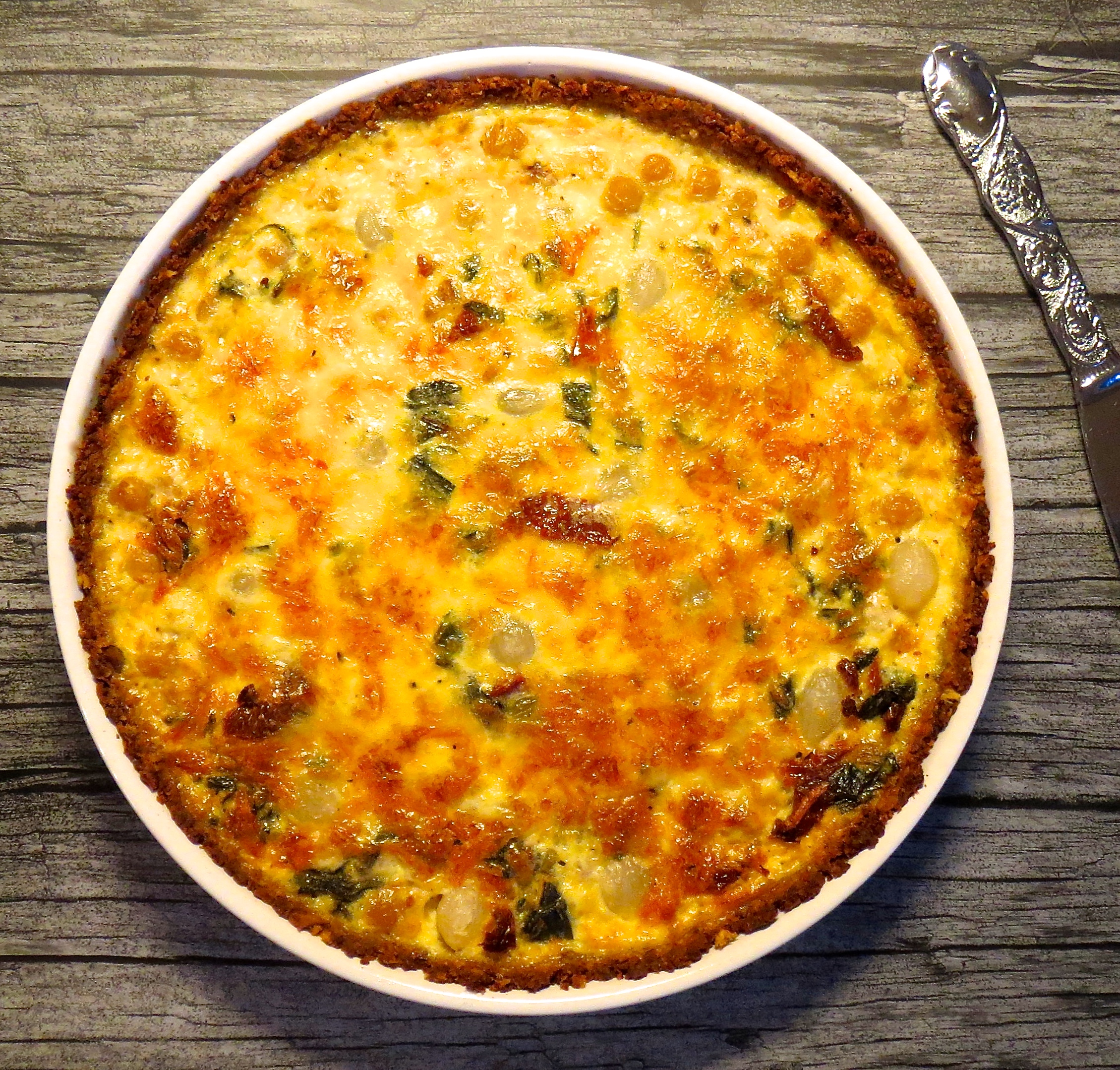 Levitä piirakkapohjalle ensin pinaatti-sipuliseos, sitten kikherneet, aurinkokuivatut tomaatit ja hillosipulit.