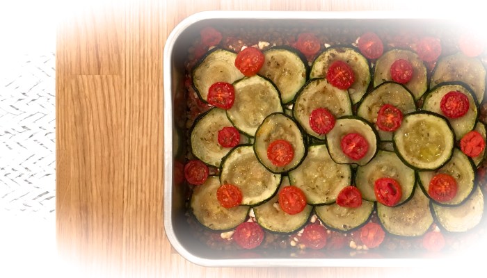 Munakoiso ja kesäkurpitsa hyppäävät lasagnelevyjen väliin