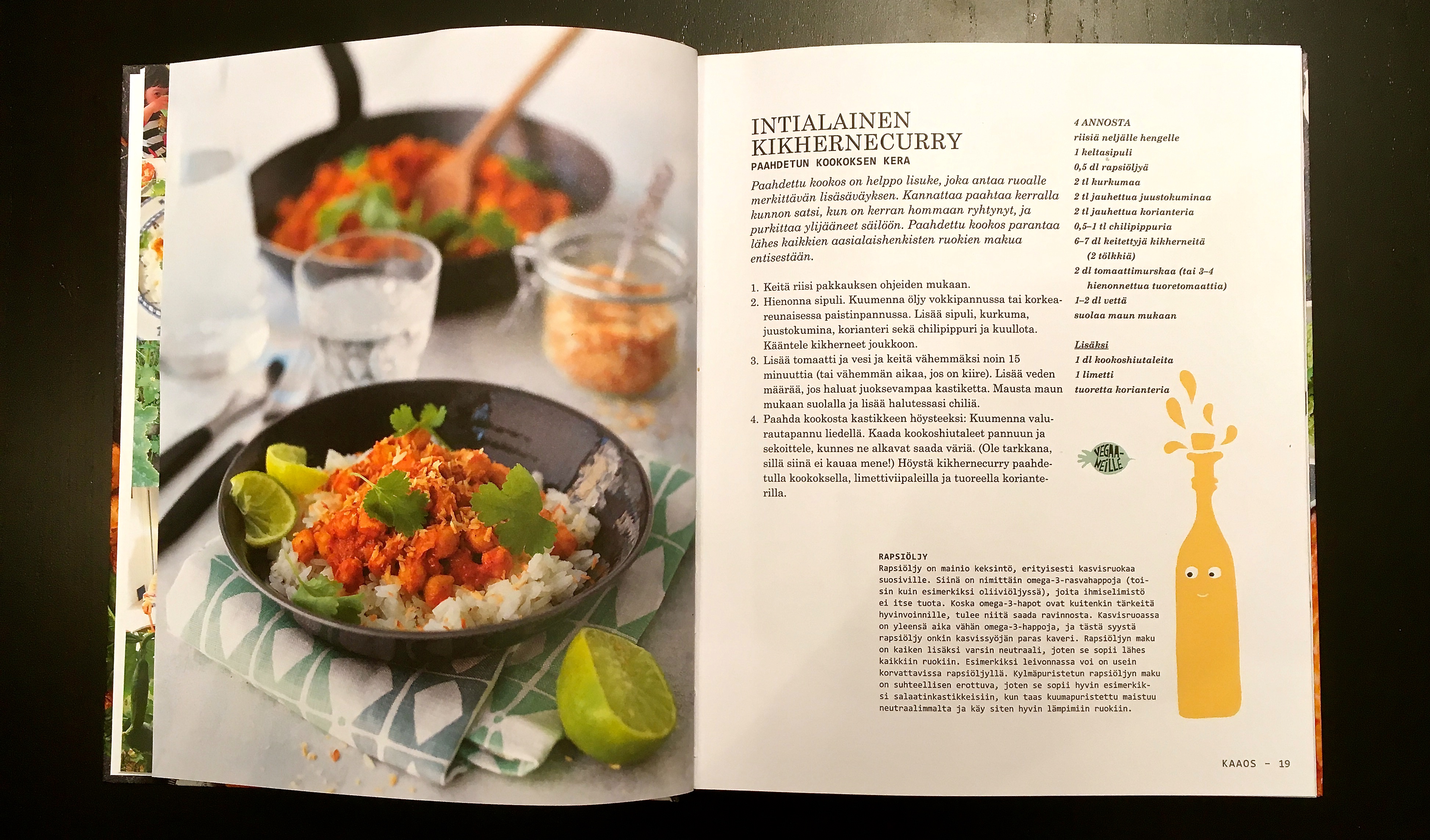 Tapani mukaan tein kuitenkin reseptiin pieniä muutoksia vaihtaen osan kikherneistä kesäkurpitsaan ja lisäkeriisin ohraan. Valokuvailu ei tällä kertaa tuottanut toivottua tulosta, joten kuva oli lainattava teoksen kuvituksesta.