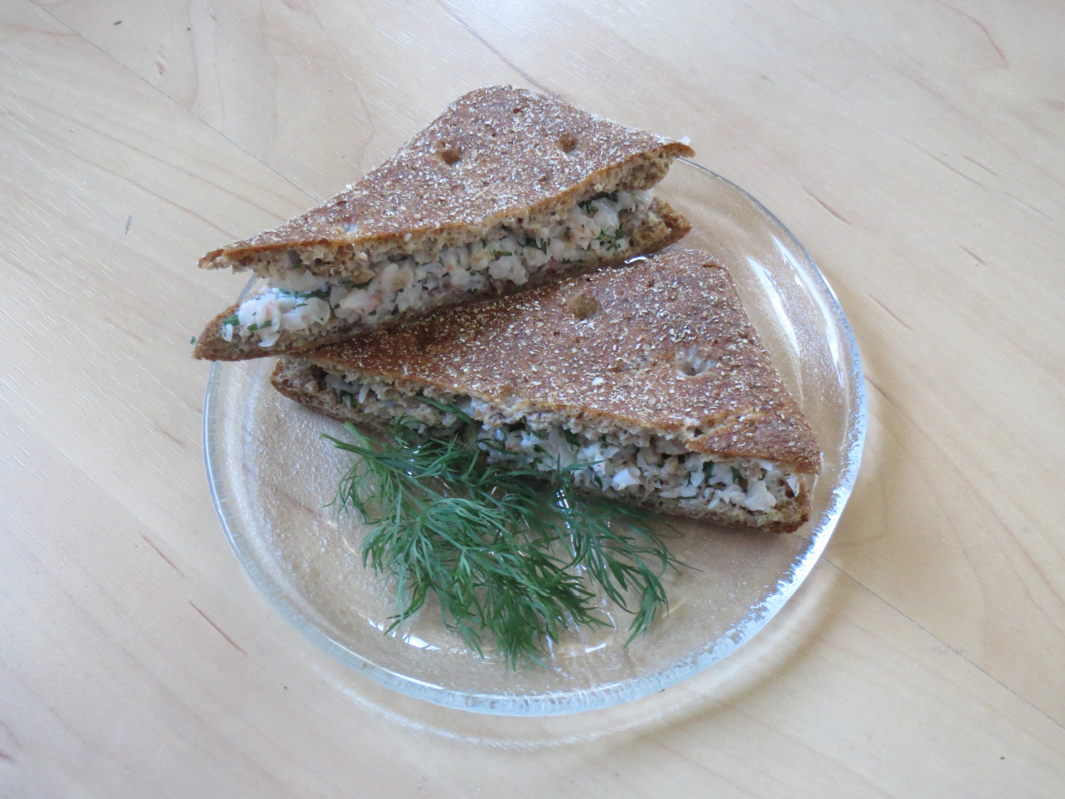 Levitä täyte ruispalan alapuolikkaalle. Nosta toinen puolikas kanneksi päältä painaen. Leikkaa leipä kahdeksi kolmion muotoiseksi palaksi.