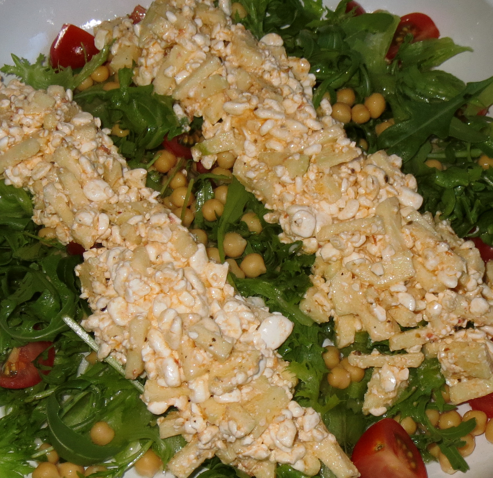 Tummat katkarapuleivät olivat jälleen kerran hiukan erilainen versio tuosta ah-aina-niin-hyvästä-ja-helposta aterian aloittajaosuudesta ja pääruoan lisäkkeeksi valmistettu raejuusto-kikhernesalaatti toimi myös mainiosti.