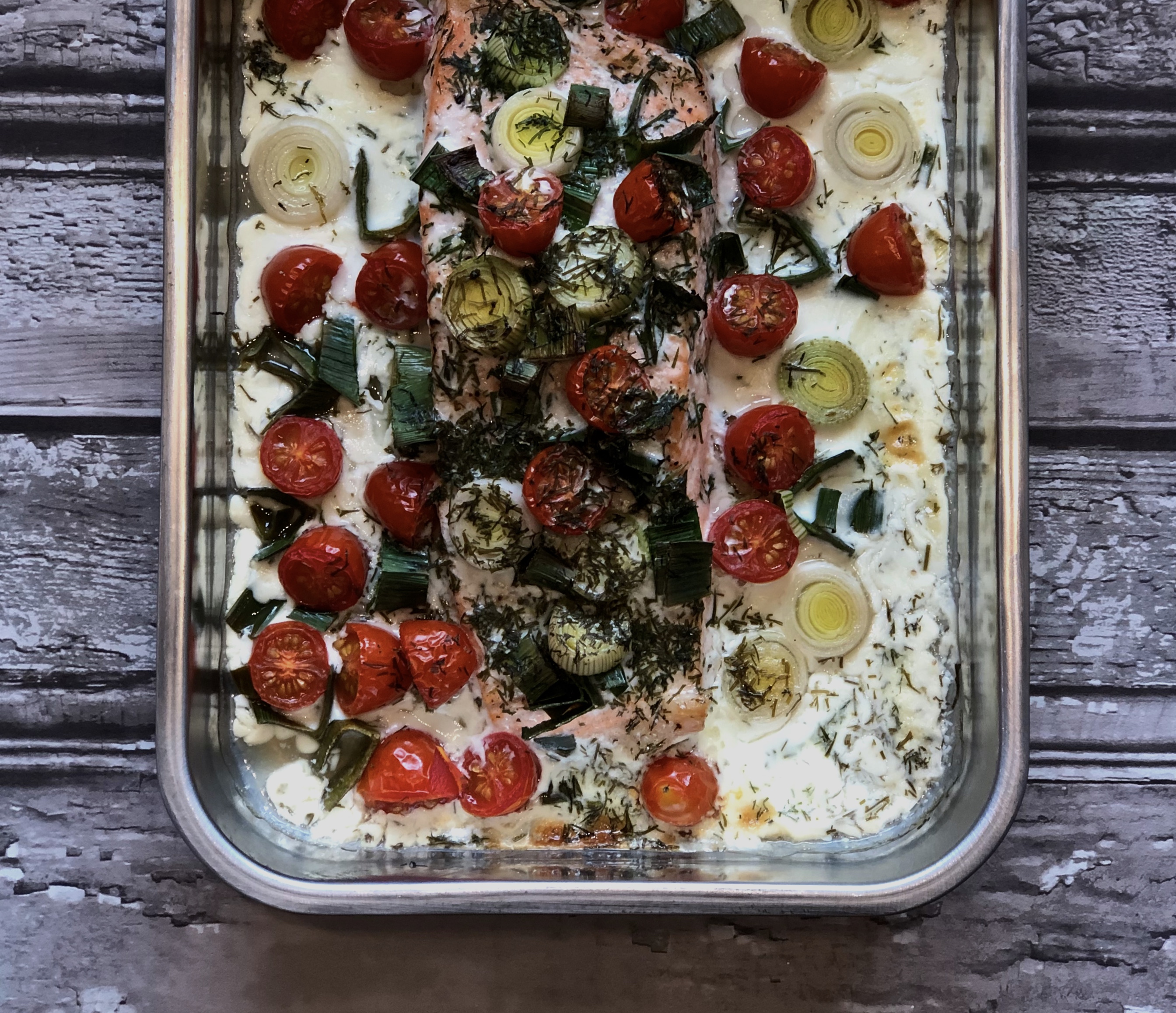 Pese purjo ja kirsikkatomaatit ja pilko ne mukaan uunivuokaan. Kaada päälle ruokakerma. Lisää pinnalle vielä tilliä ja sitruunamehua.