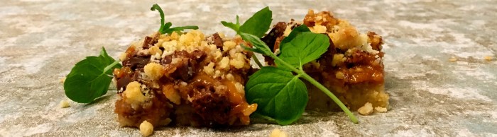 Kaada tuorejuustotäyte pohjan päälle ja ripottele omenakuutiot tasaisesti sen pinnalle. Ripottele päällimmäiseksi vielä loput murutaikinasta.