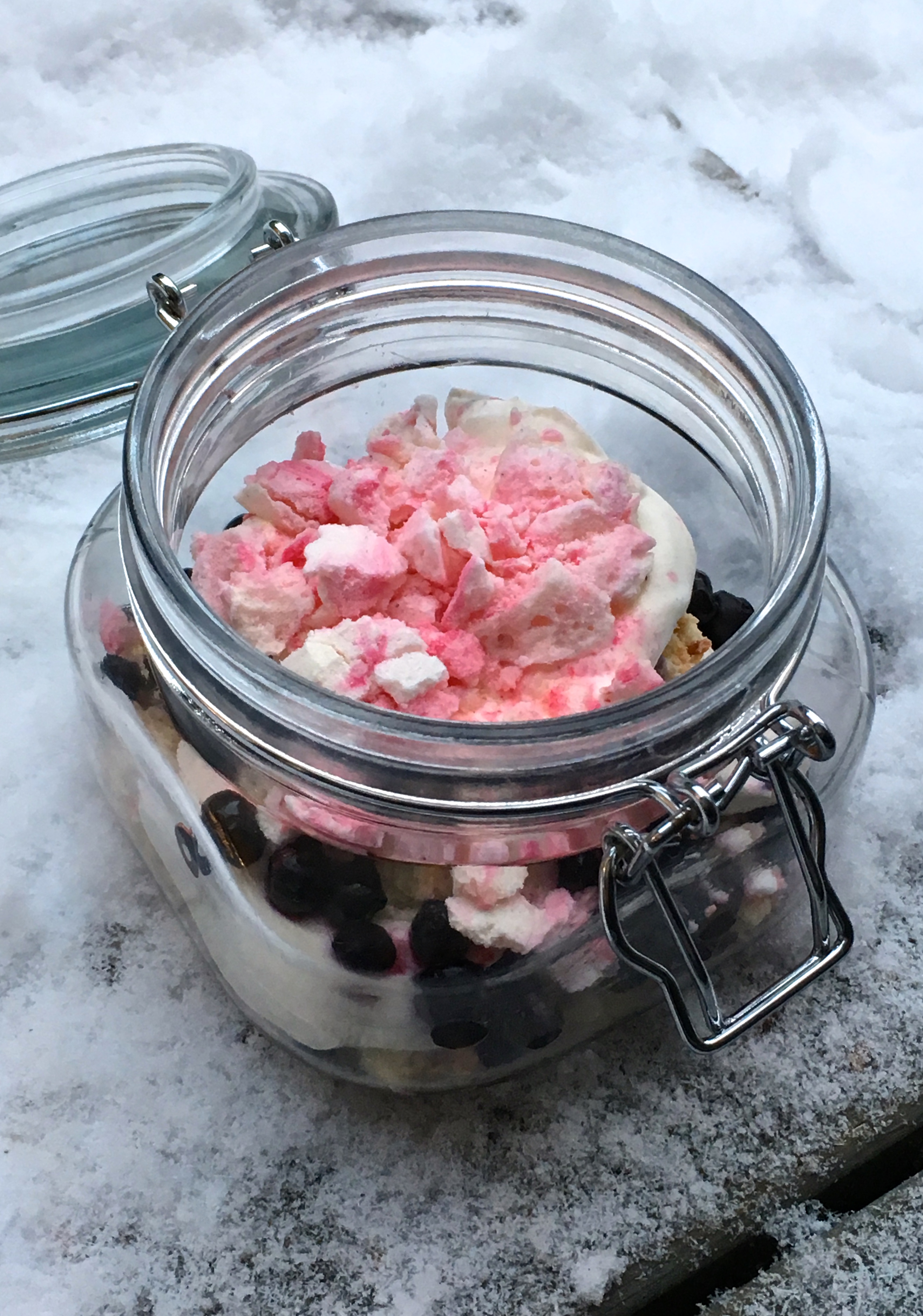 Seuraava resepti syntyi pääkopassani mietiskellessäni parhaita suomalaisia jälkiruokamakuja. Lähtökohdakseni valitsin korvapuustin ja mustikat. Jo aiemmin olin päättänyt valmistaa ”sotkua” eli omaa versiotani englantilaisesta Eton mess -jälkiruokaklassikosta.