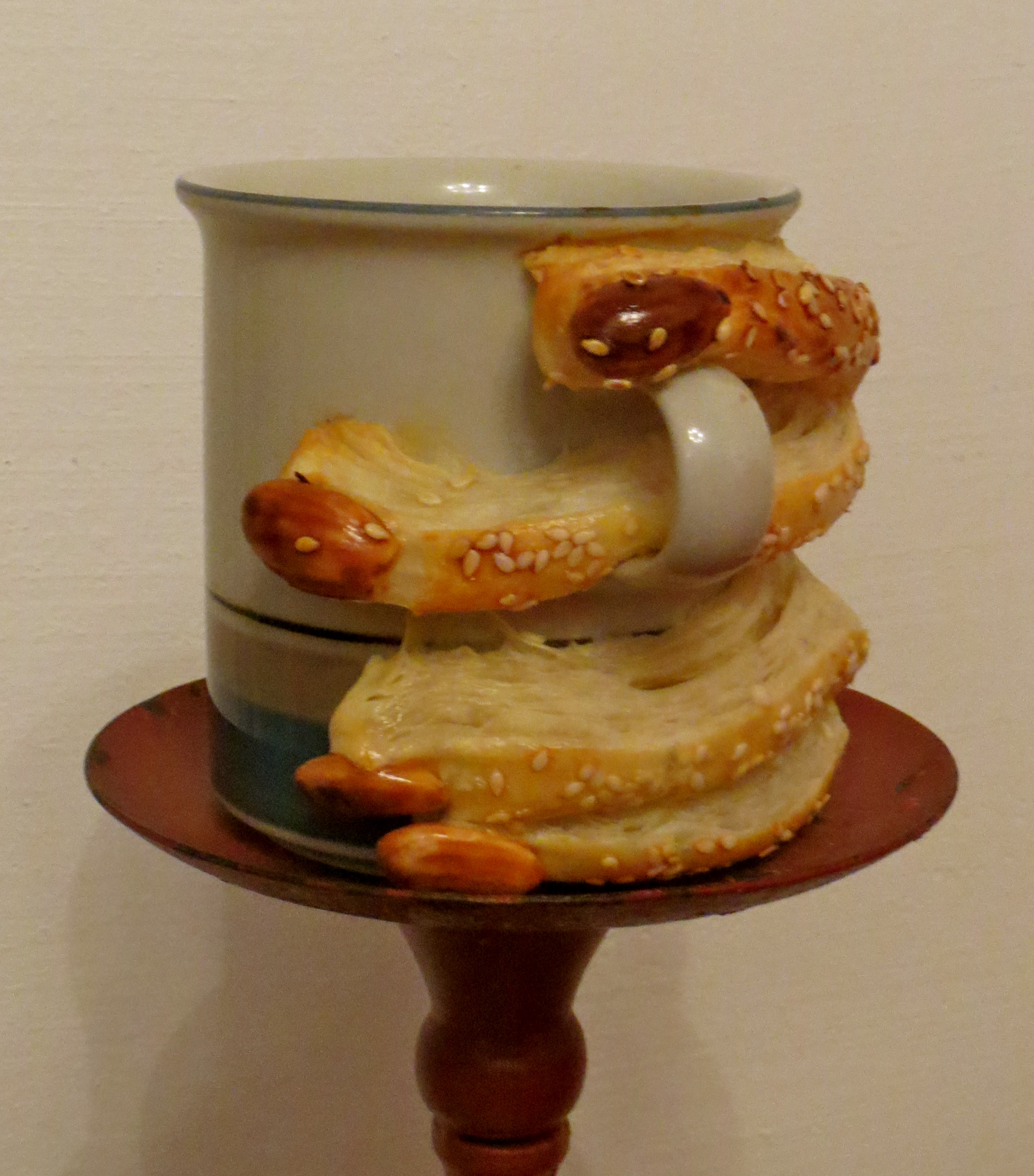 Sivele sormet keltuais-kermaseoksella. Ripottele pinnalle seesaminsiemeniä ja paina sormet kuvan tavoin uuninkestävän mukin ympärille.