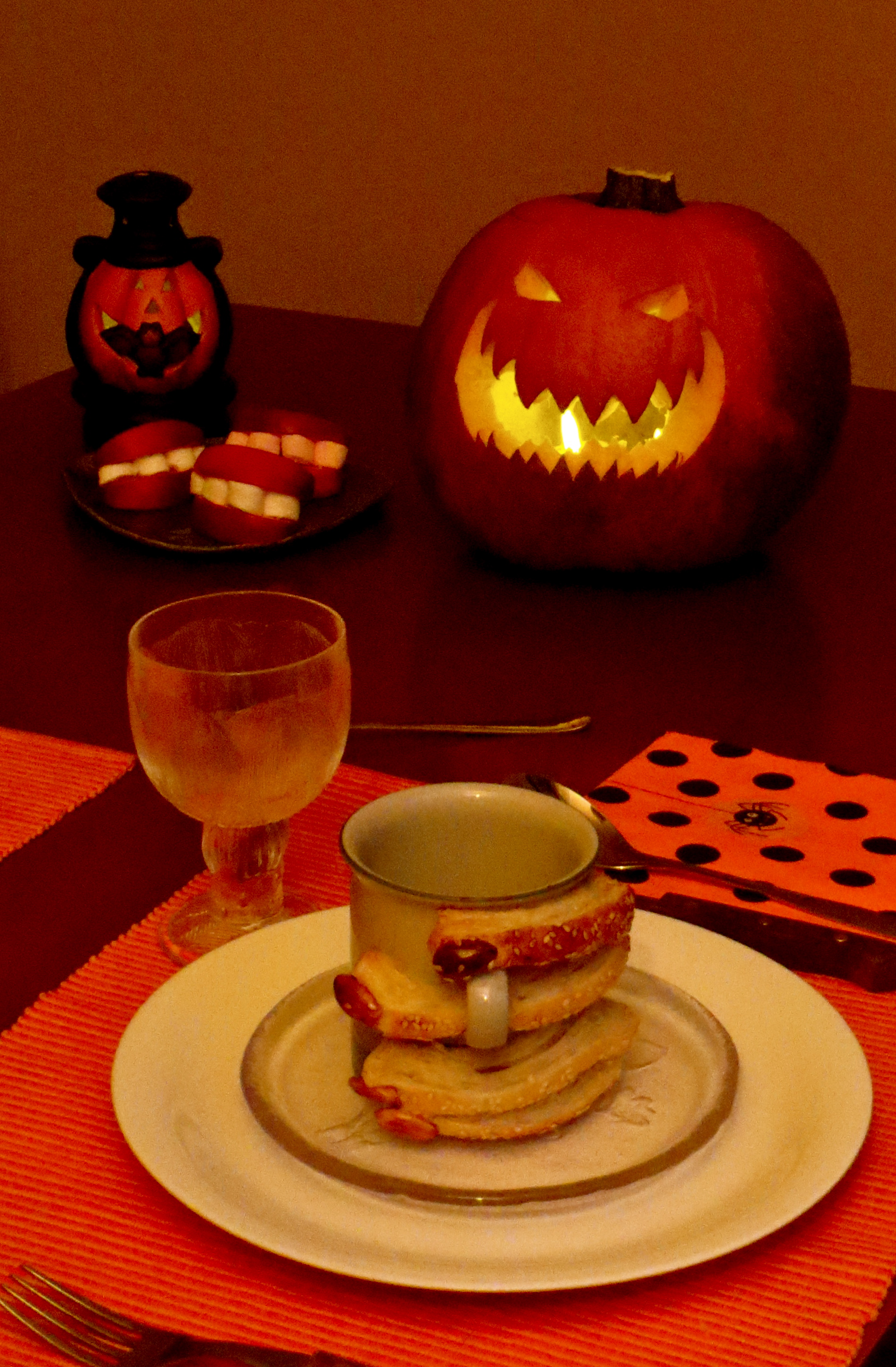 Myös me pääsimme jälleen leikkimään ruoalla, kun valmistimme jo perinteeksi kehkeytyneen kurpitsajuhla-ateriamme, jonka nautimme Aleksin luoman upean Jack O’Lanternin valossa. Lopputulos oli vallan mainio, ainoastaan hot dog -sämpylät tuottivat kuivakkuudellaan pienen IMG_3272pettymyksen. Ensi kerralla täytyy tehdä ihan niitä valkoisia vehnäleipiä, nämä grahamjauhoiset jätettäköön muihin tarkoituksiin.