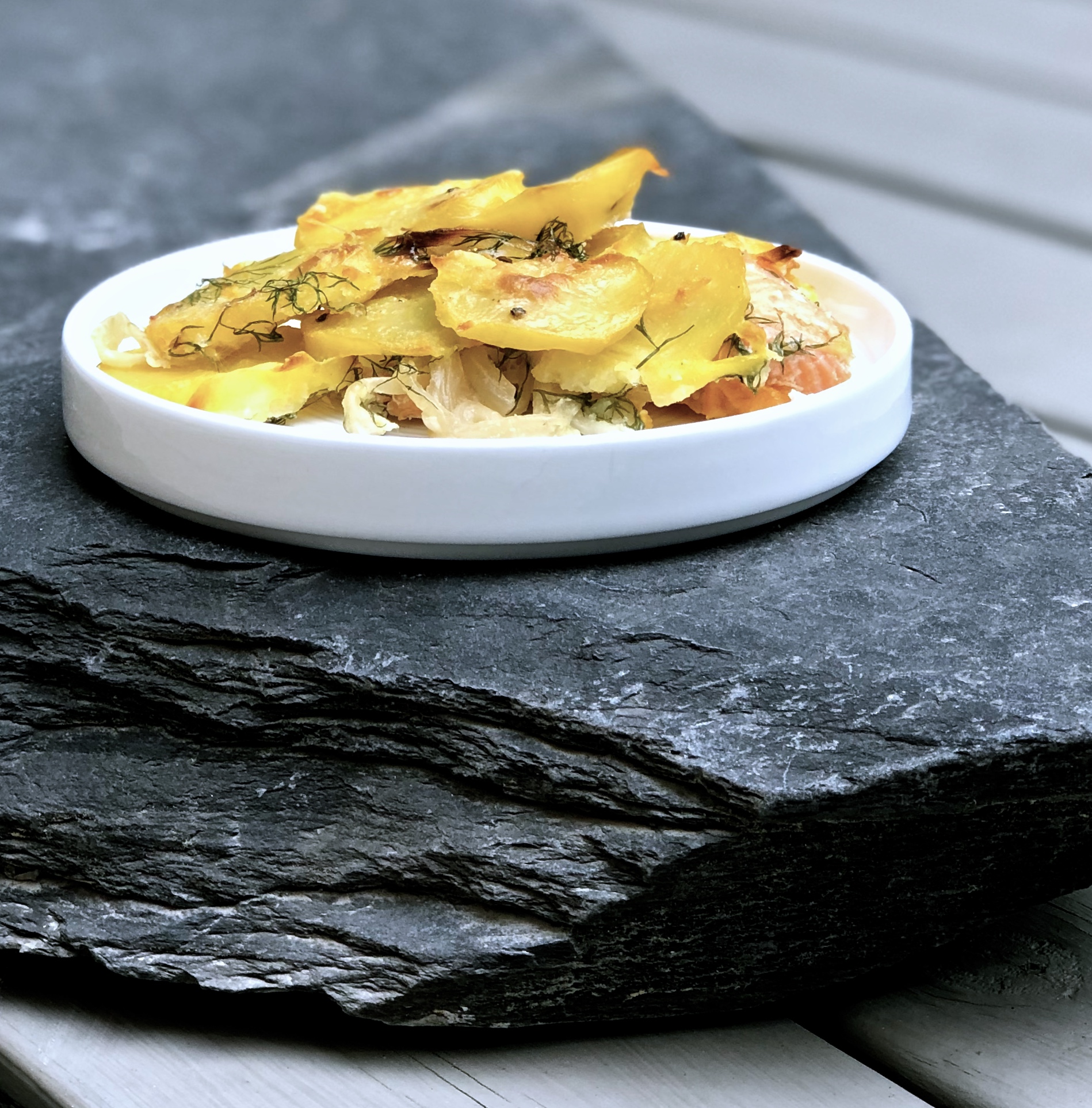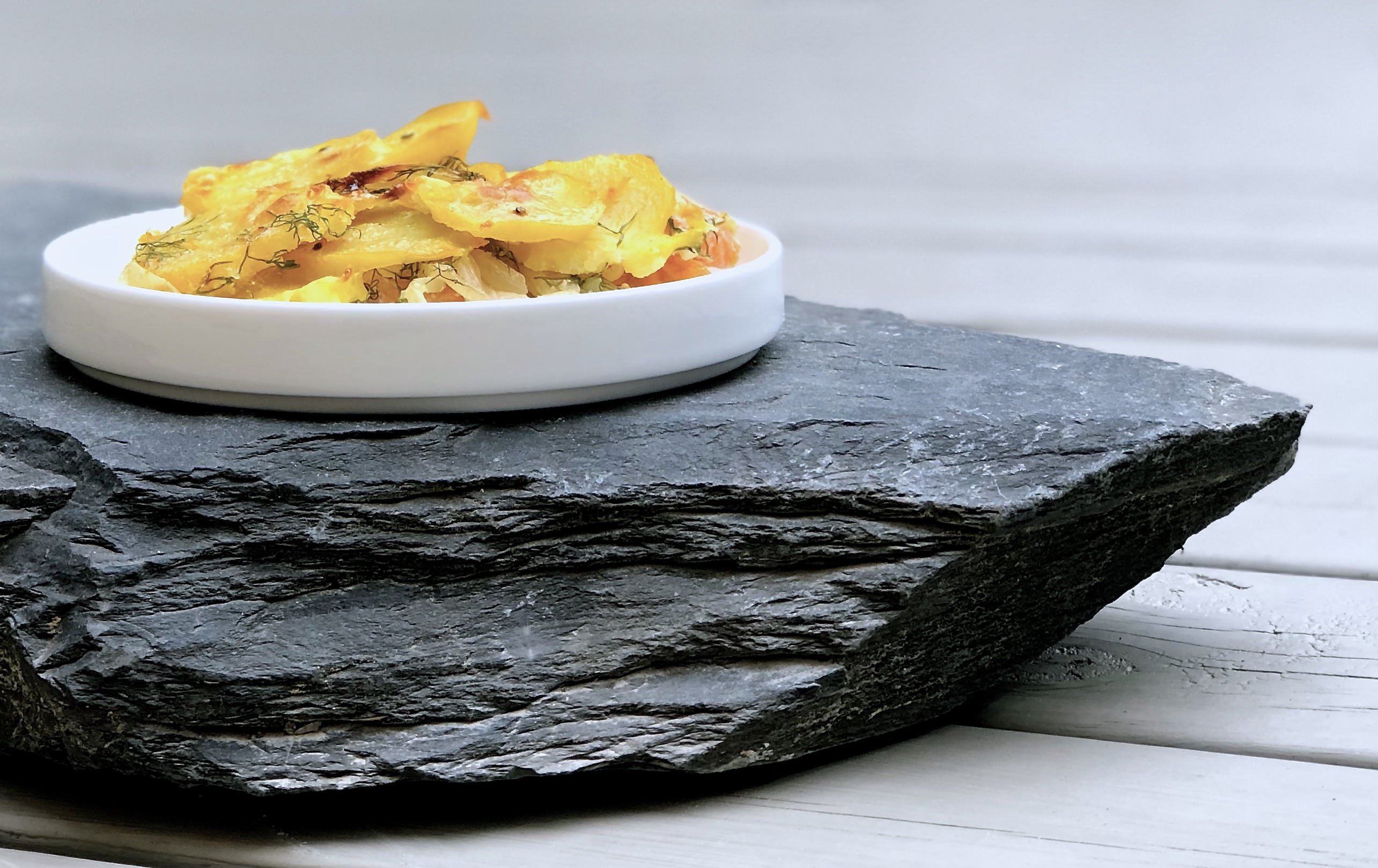 Sipulin kypsyessä kuori ja viipaloi perunat ohuiksi, noin puolen sentin viipaleiksi. Laita viipaleet kylmään veteen, että ne eivät tummu. Laita perunaviipaleet lävikköön ja huuhtaise tärkkelys pois kylmällä vedellä. Valuta.