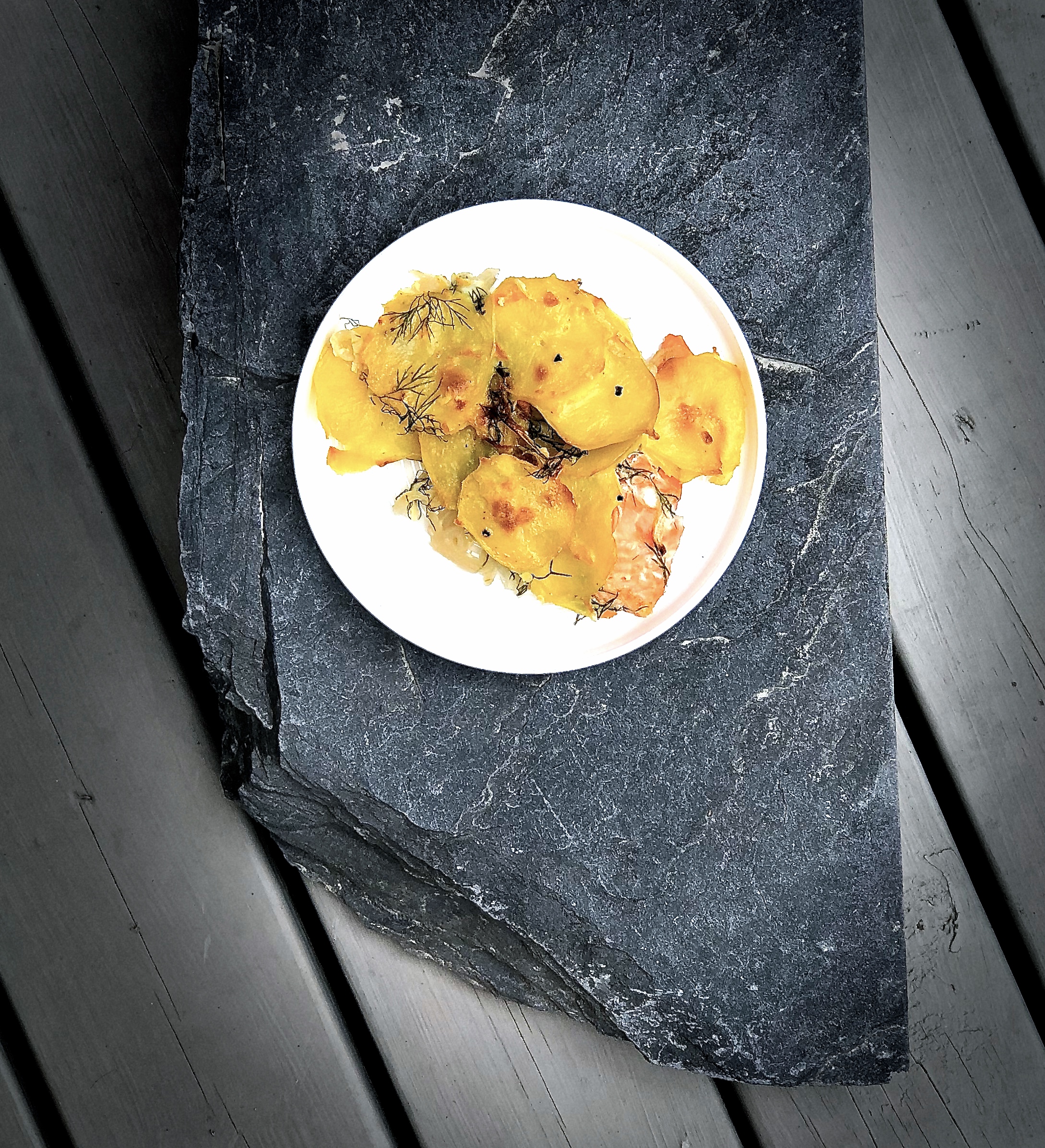 Voitele laakea, reilun kokoinen uunivuoka (vetoisuus noin 3 l). Lado puolet perunoista vuoan pohjalle. Levitä päälle kuullotettu sipuli, lohiviipaleet ja reilu kerros silputtua tilliä. Kaada puolet muna-maidosta päälle. Lado vuokaan seuraavaksi loput perunaviipaleet. Kaada päällimmäiseksi loppu muna-maito.