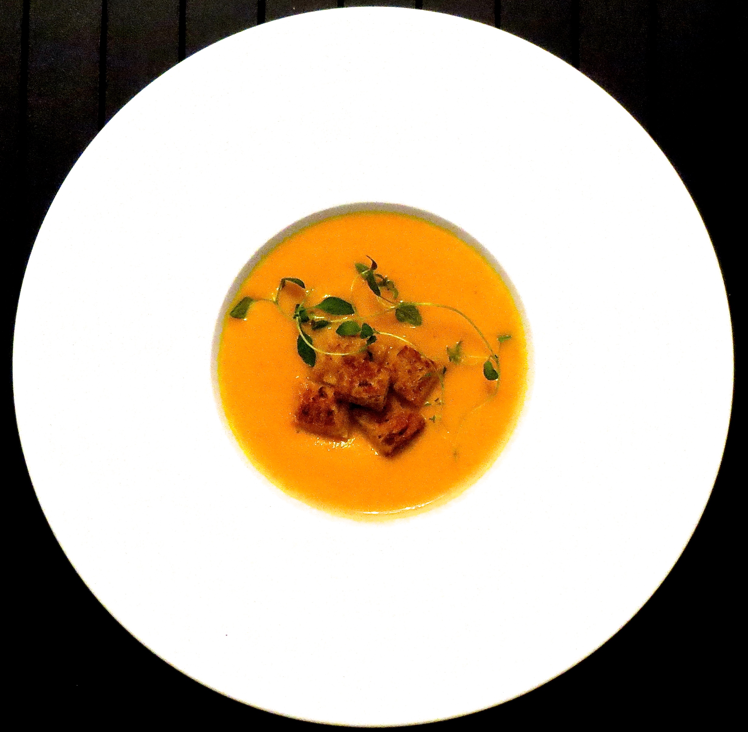 Me käytimme tarjoiluun itse tehtyjä krutonkeja sekä timjamia.