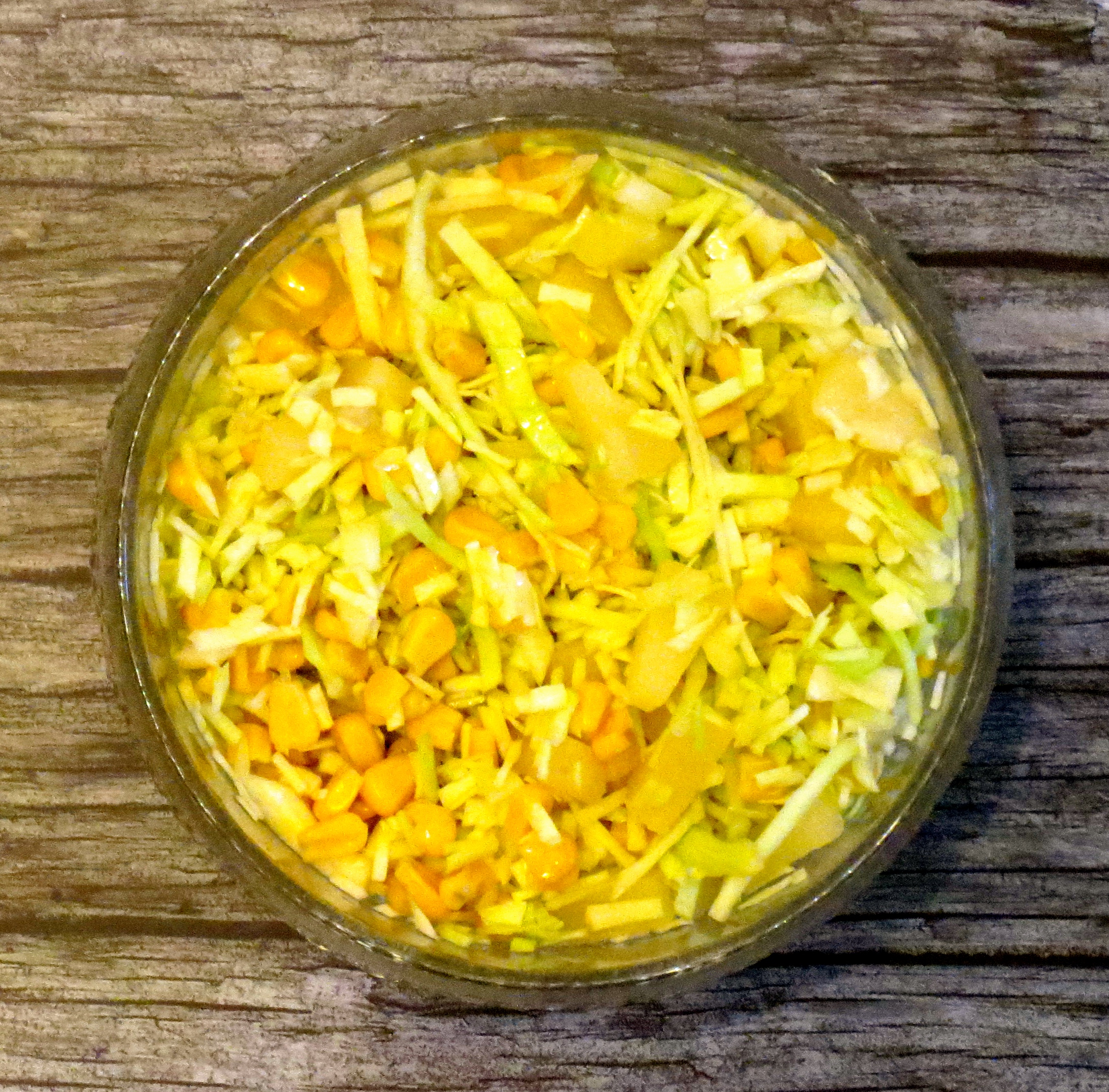 Sulata ja valuta maissit. Kuutioi kurkku ja kuori sekä hienonna punasipuli. Sekoita. Kuori ja pilko sekaan myös hunajamelonia.