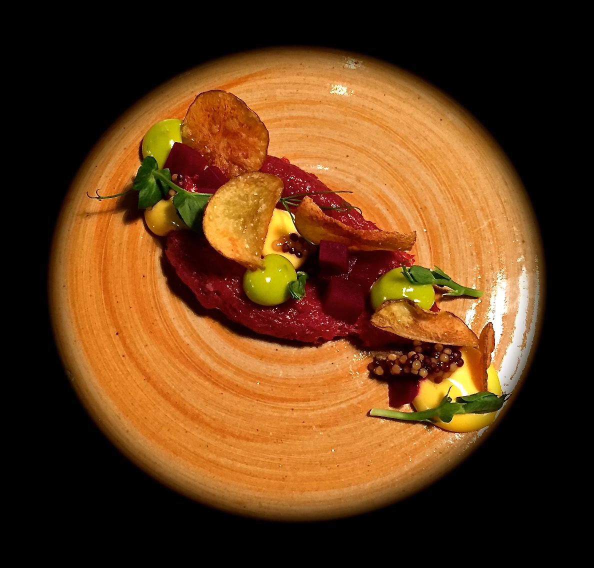 Liikkeelle lähdetään keittiön lämpimällä tervehdyksellä. Eteemme tuodaan pienet höyryävät borssikeitot rinnallaan perunarieskaa, saaristolaisleipää, voita ja katajanmarjasuolaa. Nappi aloitus tällaiseen lumimyrskyiseen iltaan. Mikäli emme olisi päätyneet menuun, olisin valikoinut juuri tämän keiton alkuruoakseni. Olisin ollut tyytyväinen.