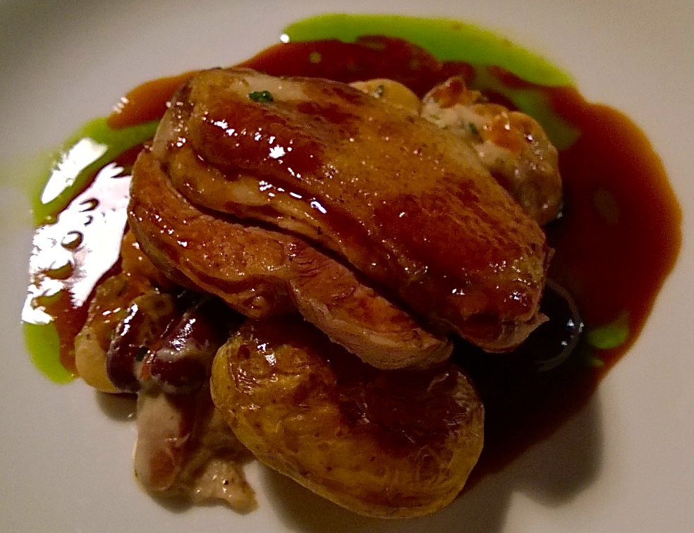 Ensimmäisen pääruoan kohdalla pääsemme maistelemaan paahdettua nieriää. Annokseen sisältyy lisäksi kampasimpukka, yksi parhaita koskaan syömiäni sellaisia, sekä kyssäkaalia ja hernepyrettä. Kokonaisuuden kruunaa valkoviinivoikastike. Tämän jälkeen tuntuu siltä, että annokset vain paranevat mitä pidemmälle päästään.