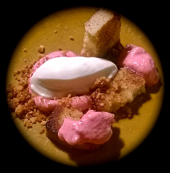 Ennen virallista jälkiruokaa saamme herätellä makeanhimoamme ihastuttavalla tervehdyksellä keittiöstä. Karpalojäädykettä ja suolatoffeeta. Nam ja maiskis, tätä kun olisi saanut kokonaisen annoksen. Varsinainen jälkiruoka, Kolmos3n sekamelska, ei sekään hullumpi ole, mutta tällaisen armottoman sokerihiiren sydäntä tummasuklaamousse ei onnistu kinuskin tavoin viemään. Toki annos on kokonaisuutena hyvä – pidän näistä sekasotkuista, joita itsekin tapaan harrastaa – ja niin ikään erityisen kaunis.
