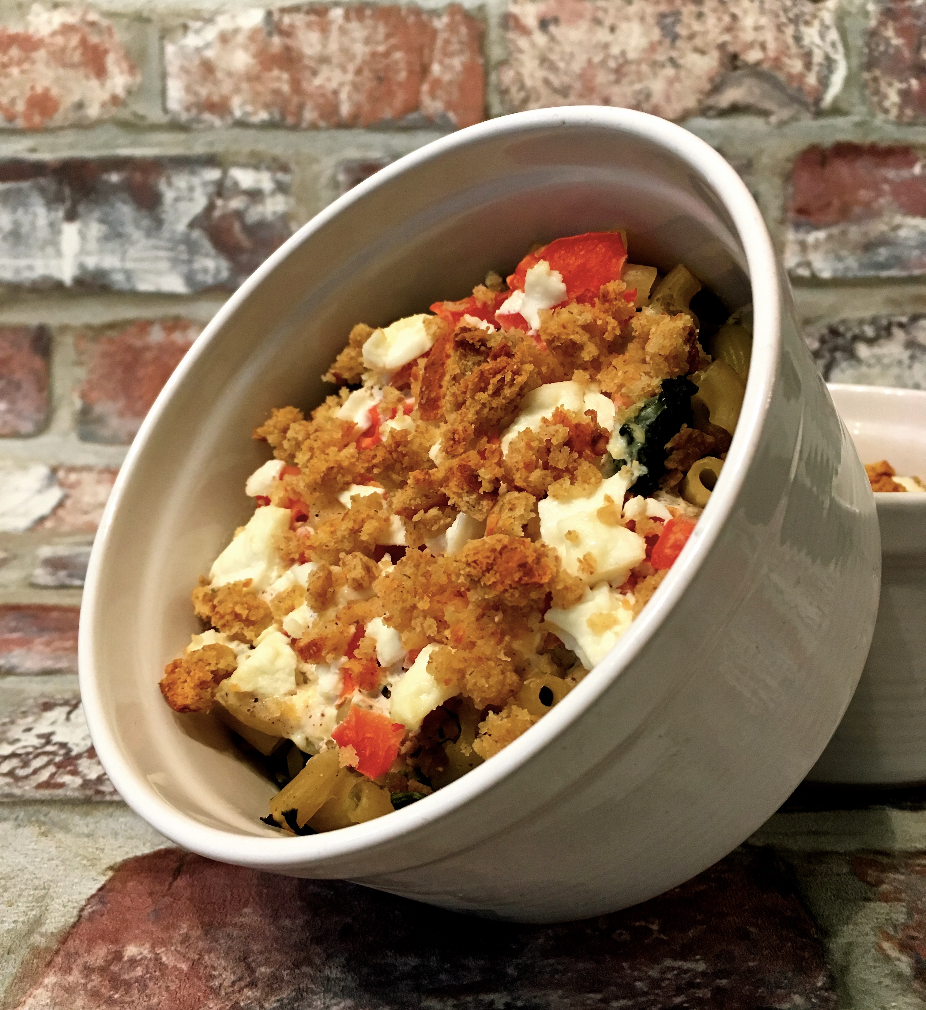 Valuta makaronit. Kuumenna kaksi ruokalusikallista voita kattilassa keskilämmöllä. Lisää jauhot ja sekoittele minuutin ajan. Lisää maito kahdessa osassa sekoittamista jatkaen. Keitä 10 min. Siirrä kattila sivuun. Lisää juustoraaste, puolet fetasta, kaneli ja mustapippuri maitokastikkeeseen. Kuumenna uuni 175 asteeseen.