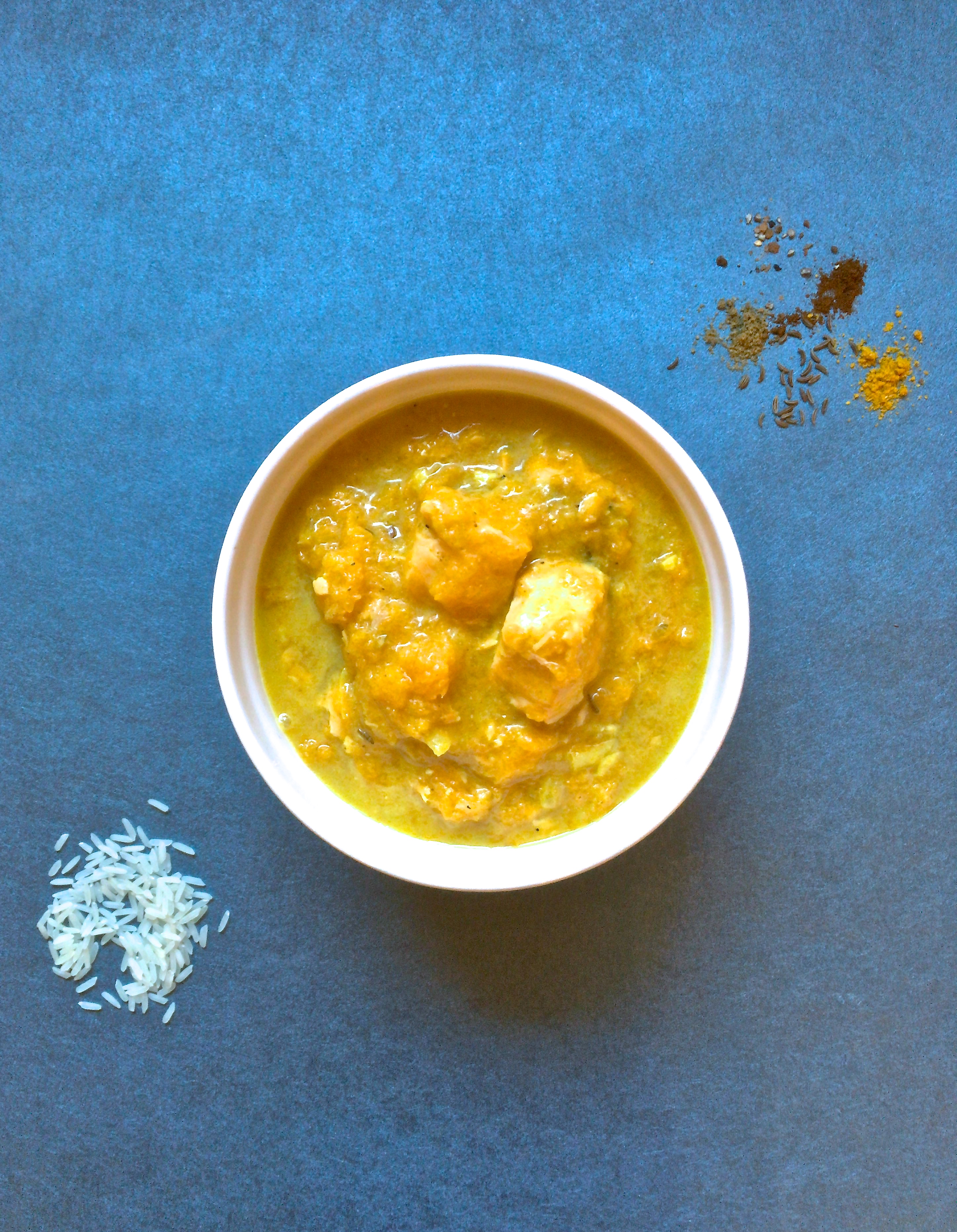 Kuori myskikurpitsa, halkaise se pitkittäin ja koverra siemenet pois lusikalla. Leikkaa kurpitsa kuutioiksi. Kuori ja hienonna sipuli ja valkosipulinkynnet. Kuori ja raasta inkivääri, hienonna chili.