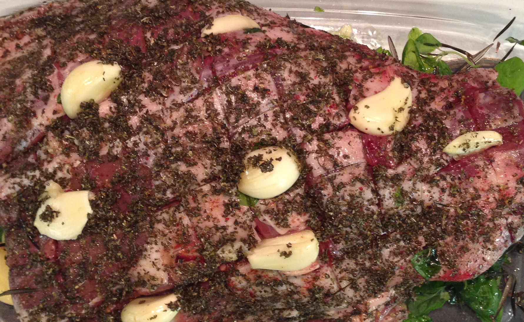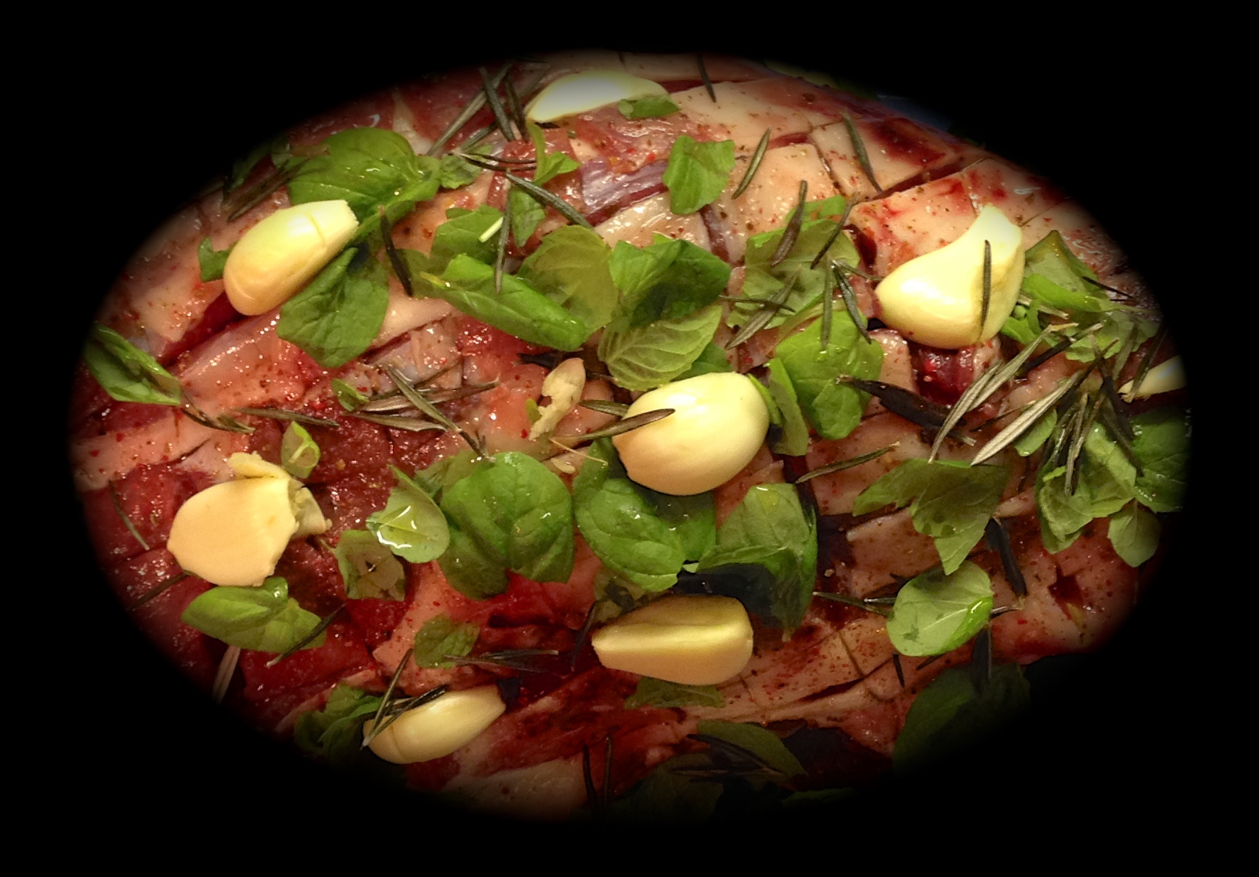 Ota vuoka jääkaapista ja nosta liha hetkeksi leikkuulaudalle. Poimi rosmariini ja minttu pois lihan päältä ja pane ne vuoan pohjalle. Jätä murskatut valkosipulinkynnet paikoilleen.