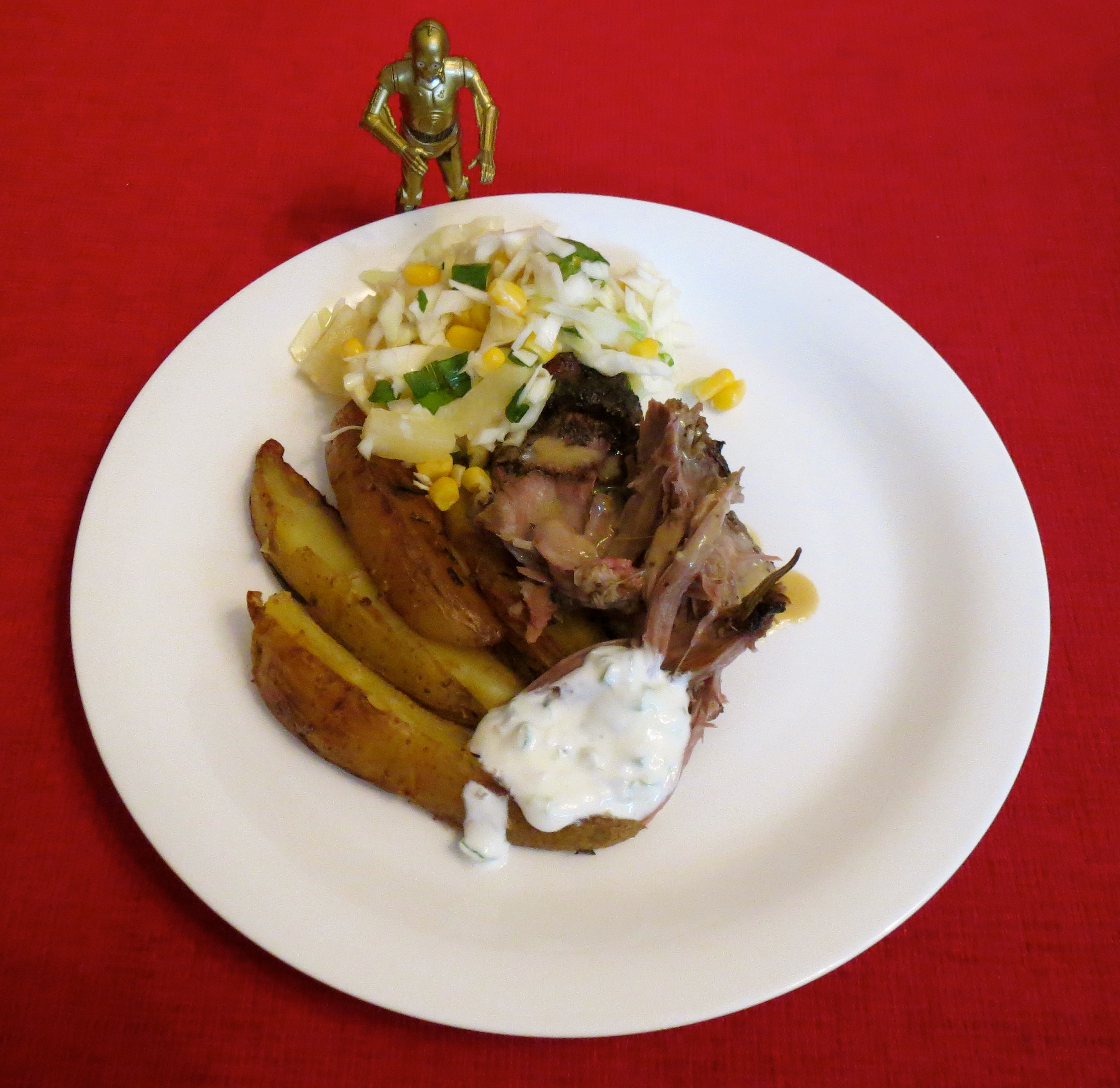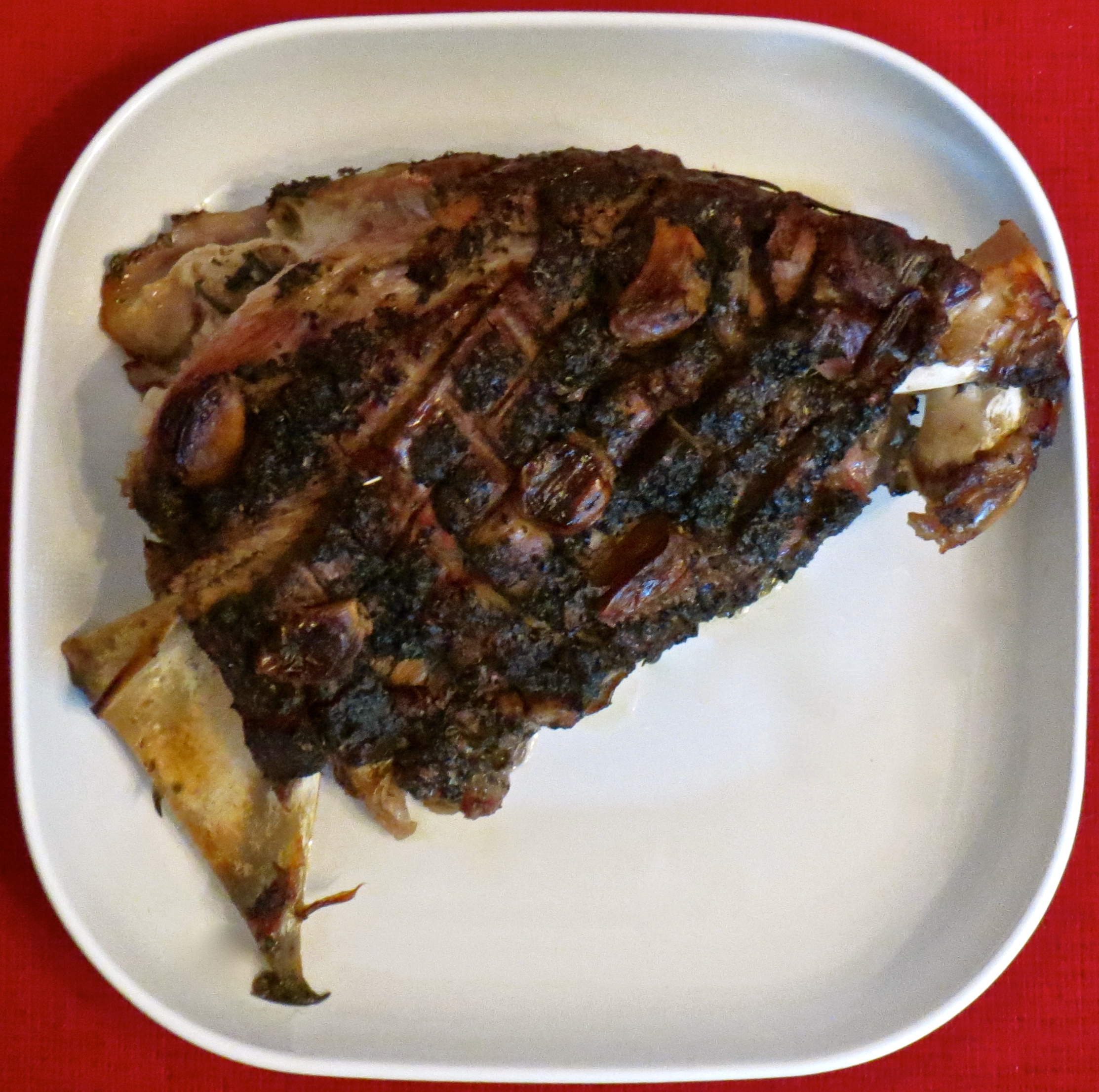 Mutta se lammas. Viime vuonna onnistuimme järjettömän hyvin (reseptiikkoja tuohon kokonaisuuteen voit tarkastella täältä), joten myös tällä kertaa odotukset olivat korkealla. Ohje nyt valmistuneeseen paahdettuun lampaan lapaan, joka sai rinnalleen rosmariiniperunoita löytyi jo vuodenvaihteen tienoilla Vera Jordanovan keittokirjasta Don’t Miss a Bite, mutta toteutukseen se pääsi vasta nyt, tuntui istuvan hyvin tähän juhlaan. Ja hyväähän se olikin, mureaa kuin mikä. Ihan viime vuoden tasolle emme tosin yltäneet, mutta silloin puhuttiinkin yhdestä kaikkien aikojen parhaiten onnistuneista aterioistamme…