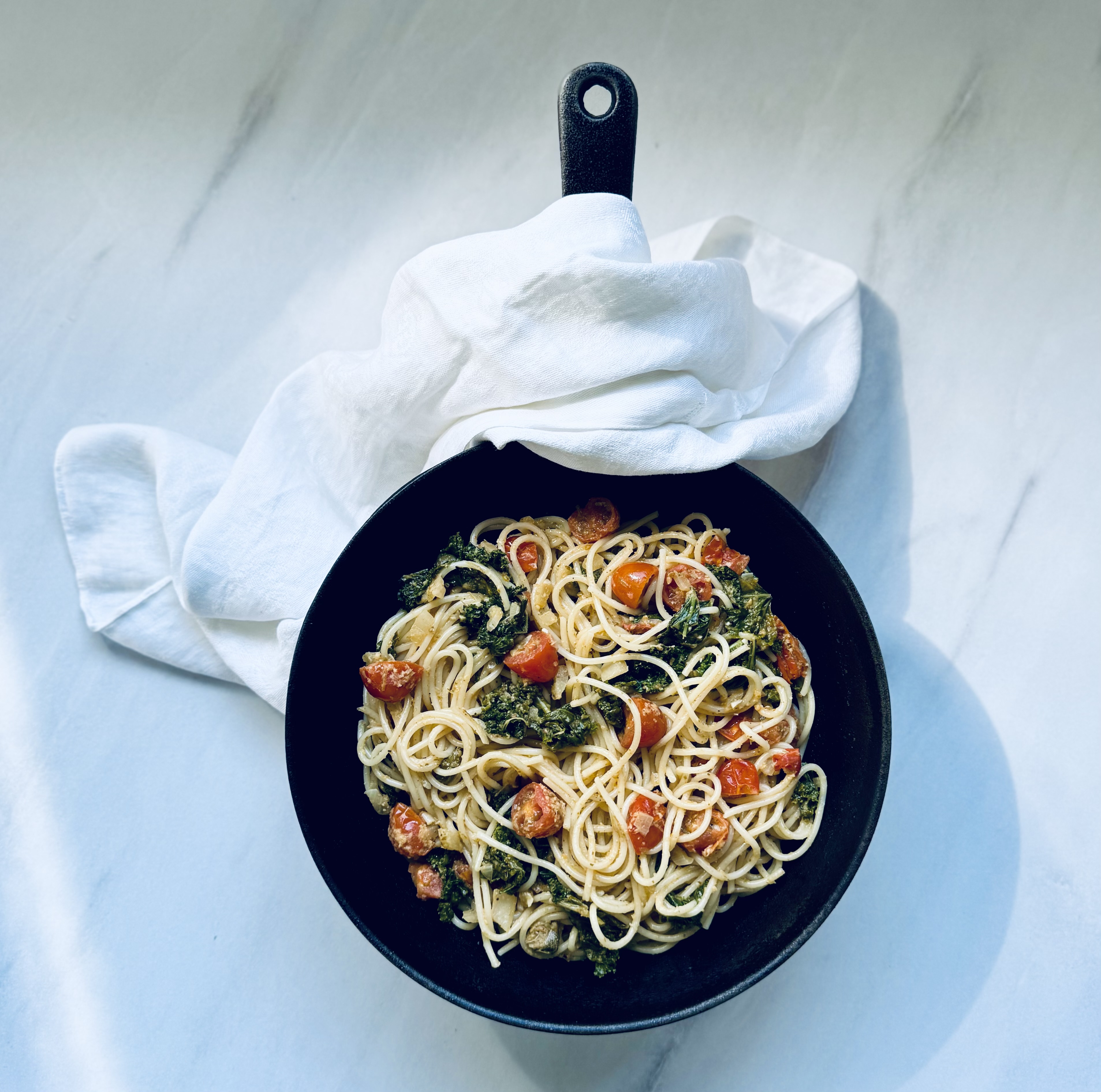 Lisäksi: pastaa parmesanraastetta (Valitse niin halutessasi vegaaninen versio.) kirsikkatomaatteja