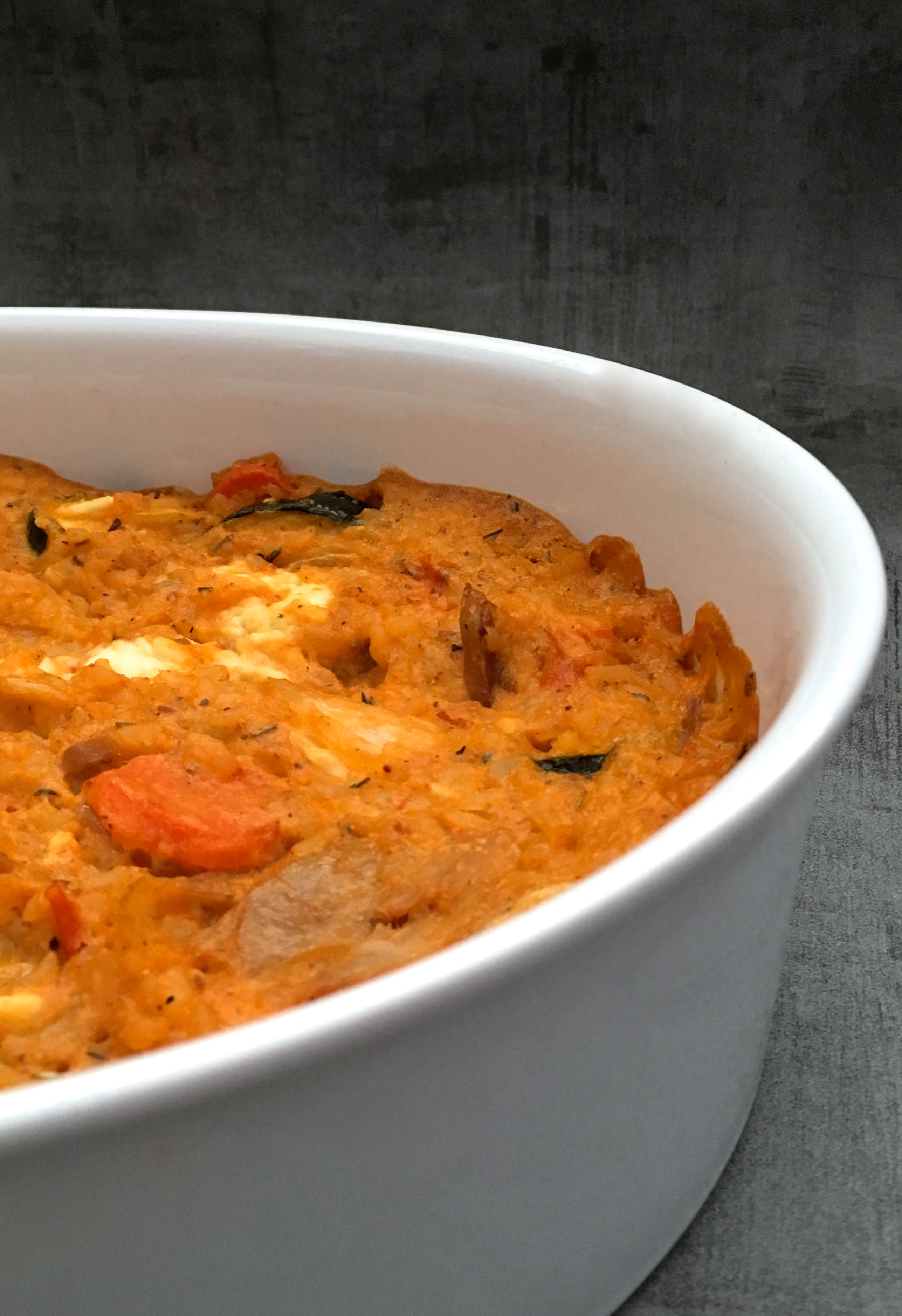 Seuraava ruoka sai alkunsa siitä, kun keittelin jälleen kerran liikaa riisiä. Sen lisäksi pakastimeen oli varastoitu loput vaahterasiirapilla glaseeratusta broilerista ja jääkaapista löytyi lajitelma erinäisiä kasviksia. Mitäpä näistä? Ensimmäisenä mieleeni tuli paistettu riisi, mutta koska taloutemme oli kananmunaton, täytyi tuo vaihtoehto hylätä. Näinpä päädyin sujauttamaan ainekset uunin lämpöön ja marinoimaan koko komeuden punaisella pestolla. Idean, jota kehittelin varastotilanteellemme sopivammaksi, nappasin Puolialaston kokki -blogista. Kiitos tästä, paistoksesta tuli hyvää ja voin suositella kokeilemaan tällaista tapaa tuhlata riisin rippeitä. Hyvää ja niin helppoa!