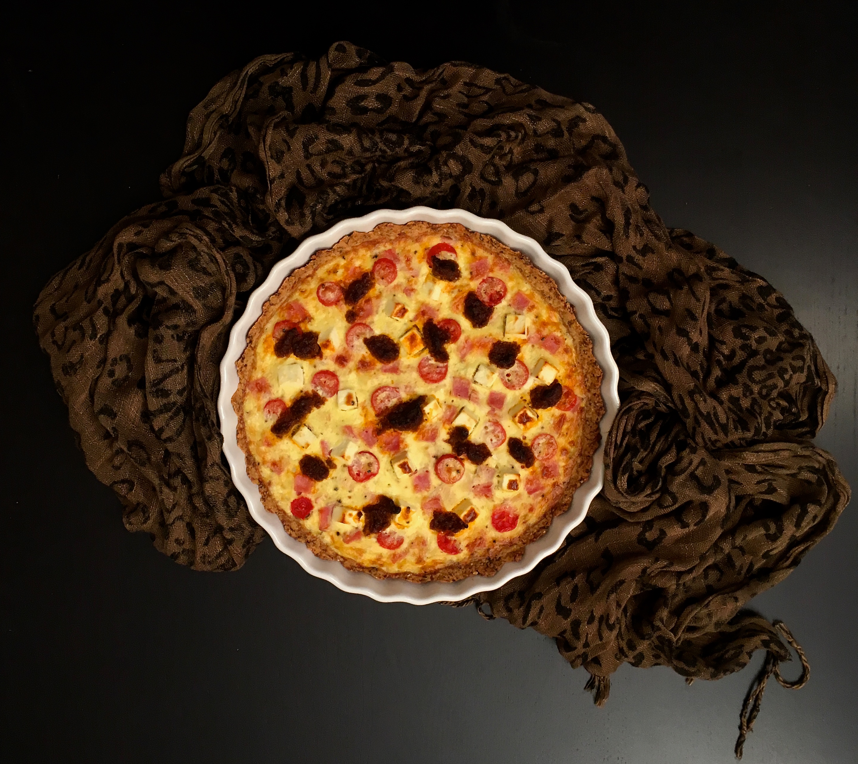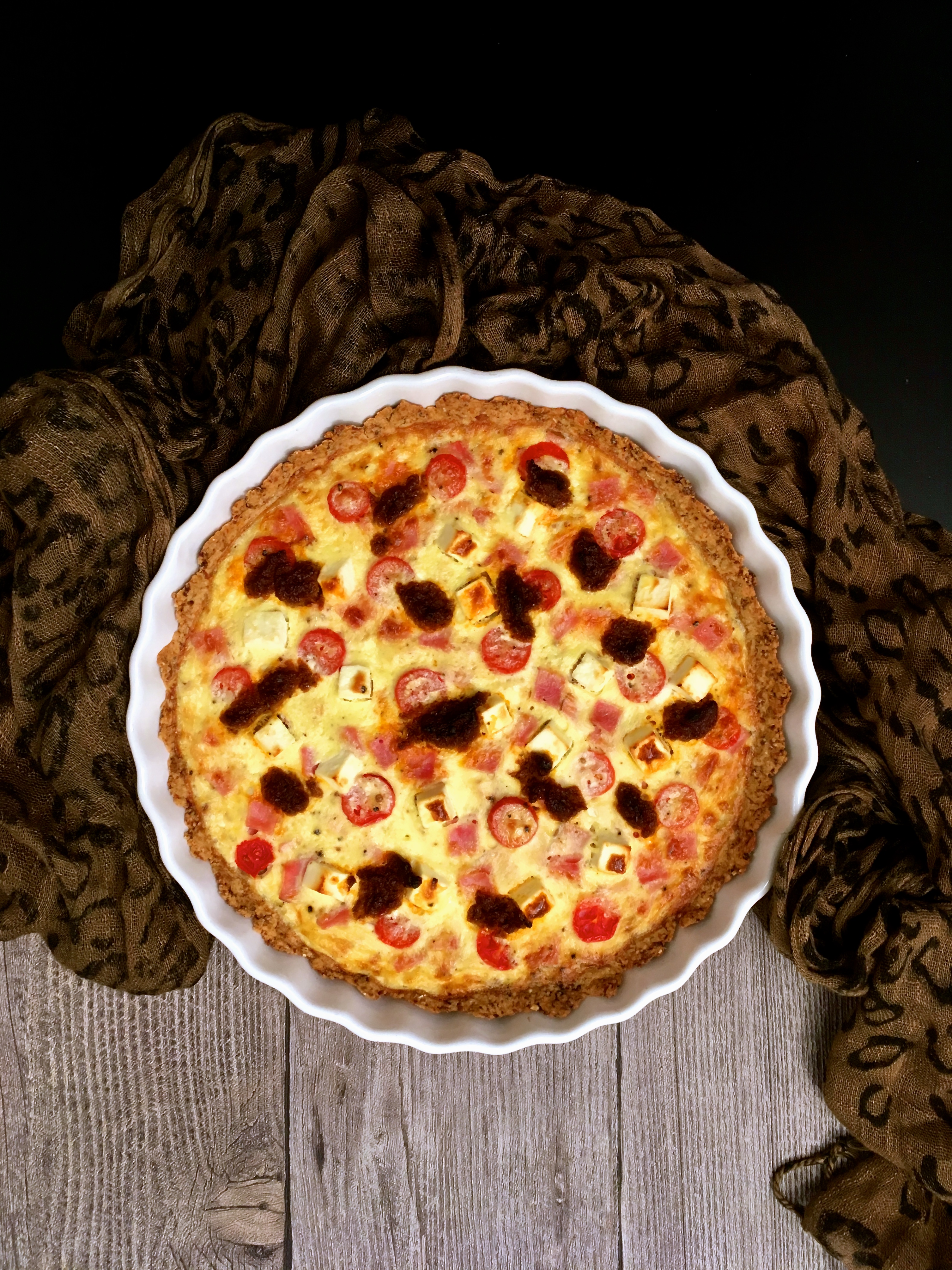 Pestoinen kinkkupiirakka makaronisella pohjalla