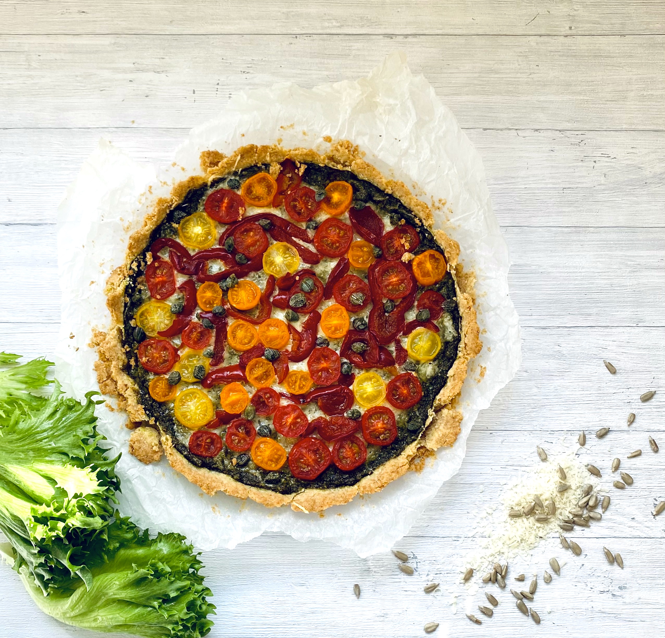 Valmista ensin pohja. Kuutio kylmä voi ja laita kulhoon. Lisää kulhoon jauhot ja suola. Nypi voi ja jauhot sekaisin. Lisää lopuksi kylmä vesi ja muotoile taikinasta pallo. Kääri taikina kelmuun ja nosta jääkaappiin puoleksi tunniksi. Tee seuraavaksi pesto alla olevan ohjeen mukaan. Voitele tai leivinpaperoi piirakkavuoka. Painele taikina tasaisesti vuokaan, myös reunoille. Levitä pesto piirakkapohjalle. Lisää päälle juustoraaste, säilykepaprikat, siivutetut tomaatit ja kaprikset. Paista piirakkaa 200-asteisen uunin alaosassa noin 30 min. tai kunnes pohja on täysin kypsä.