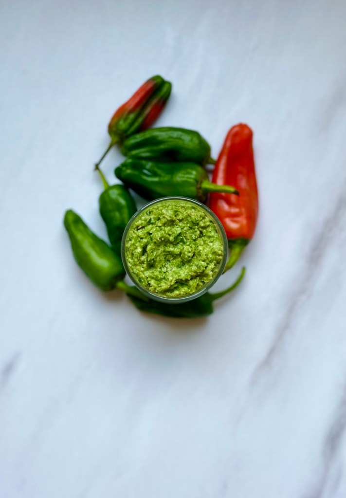 1 iso (vihreä) paprika/vastaava määrä Pimientos de Padron -grillipaprikoita 2 rkl auringonkukansiemeniä puoli ruukkua basilikaa 1 rkl sitruunamehua 50 g juustoraastetta 1 rkl oliiviöljyä 1 pieni valkosipulinkynsi suolaa mustapippuria myllystä