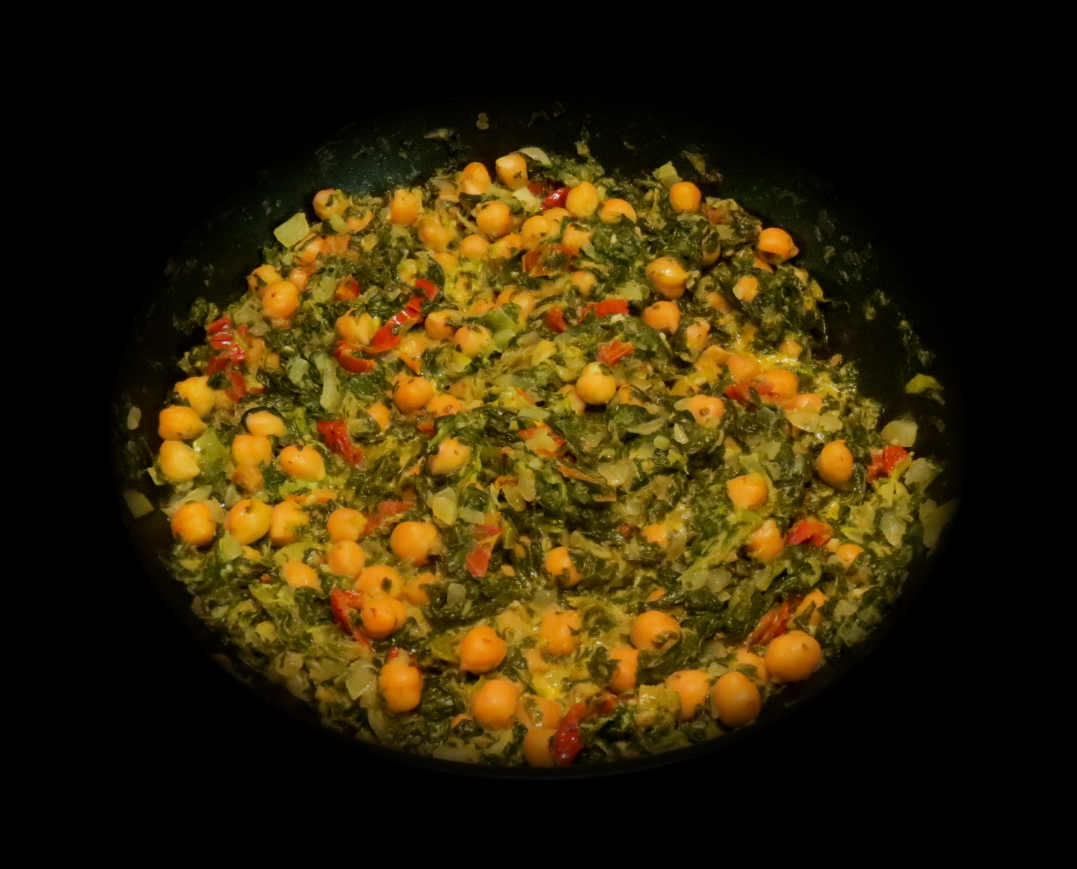 Valuta kikherneistä vesi pois ja lisää ne pannulle. Lisää pannulle pinaatti kourallinen kerrallaan. Jos käytät tuoretta pinaattia, lisää uusi kourallinen vasta sitten, kun edellinen satsi pinaatilehtiä on mennyt hieman kasaan. Lisää lopuksi kookosmaito ja limemehu.