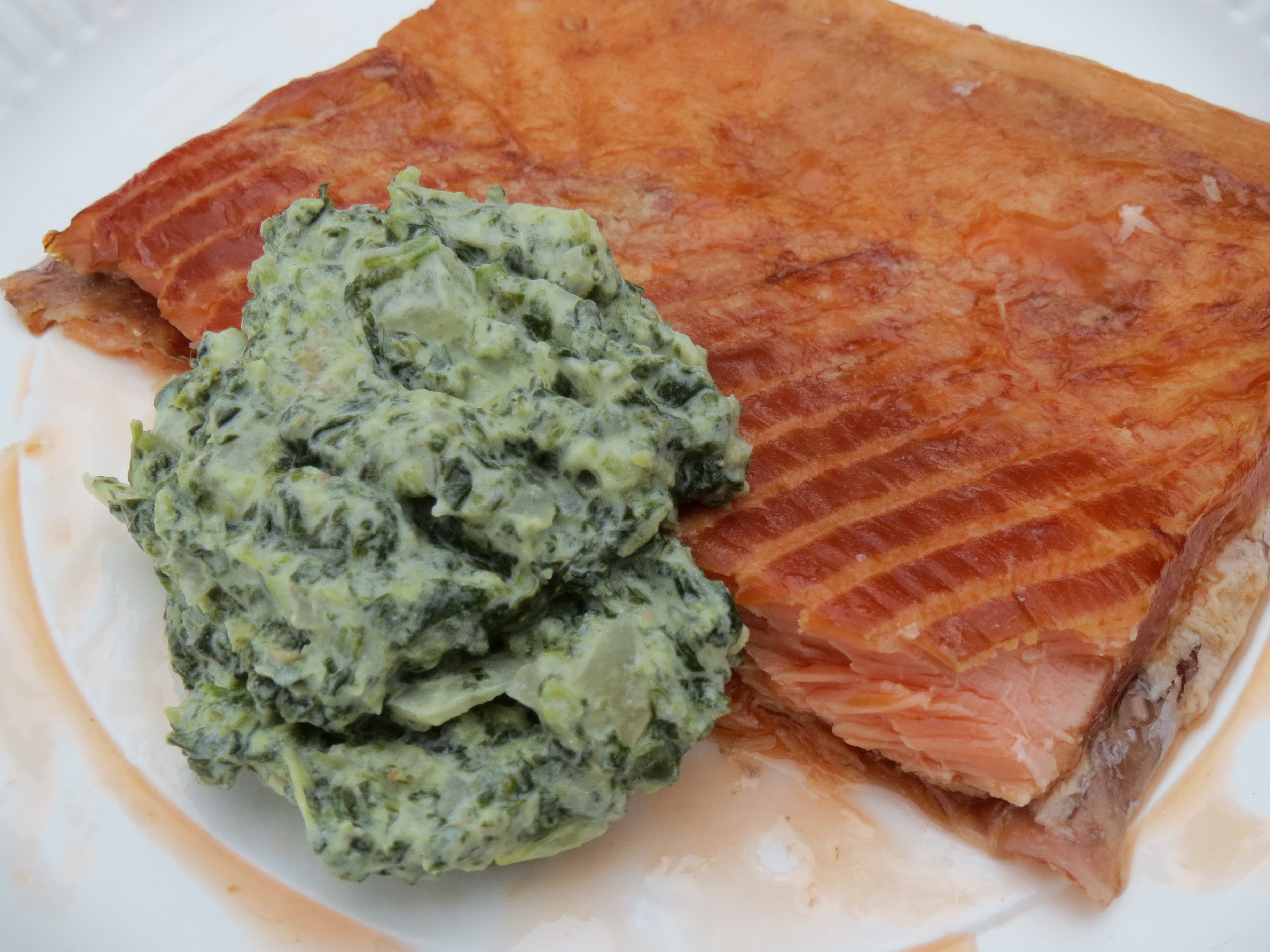 Valmista pinaattimuhennos: hienonna kuorittu sipuli ja valkosipulinkynnet. Kuullota sipulit voissa. Lisää pinaattipalat ja sekoita, kunnes pinaatti on sulanut ja kiehahtanut. Lisää kevytkerma ja kiehauta sekoittaen. Mausta suolalla ja pippurilla.