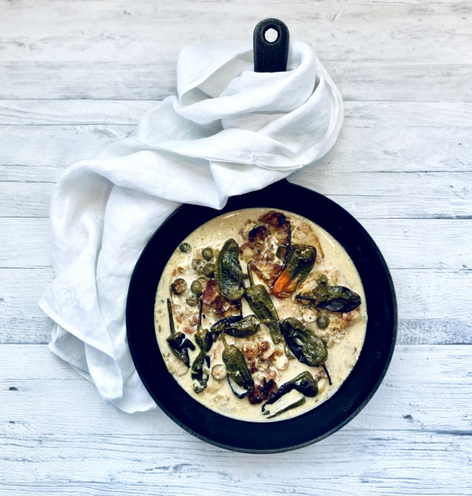 Haudutetut possunleikkeet valmistuvat pienten alkuvalmistelujen jälkeen uunissa, joten onnistuakseen tämä ruokalaji ei vaadi oikeastaan muuta kuin aikaa odotteluun. Dijon-kermakastike tuo ruokaan ranskalaishenkisyyttä sekä täyteläisyyttä, pekoni ja kaprikset sopivasti pikanttia suolaisuutta. Pimientos de Padrón -paprikoita lisäsin pataan tuomaan sekä ulkonäköä että hauskaa jännitystä, josko mukaan tällä kertaa olisi eksynyt jokunen tulinenkin yksilö.