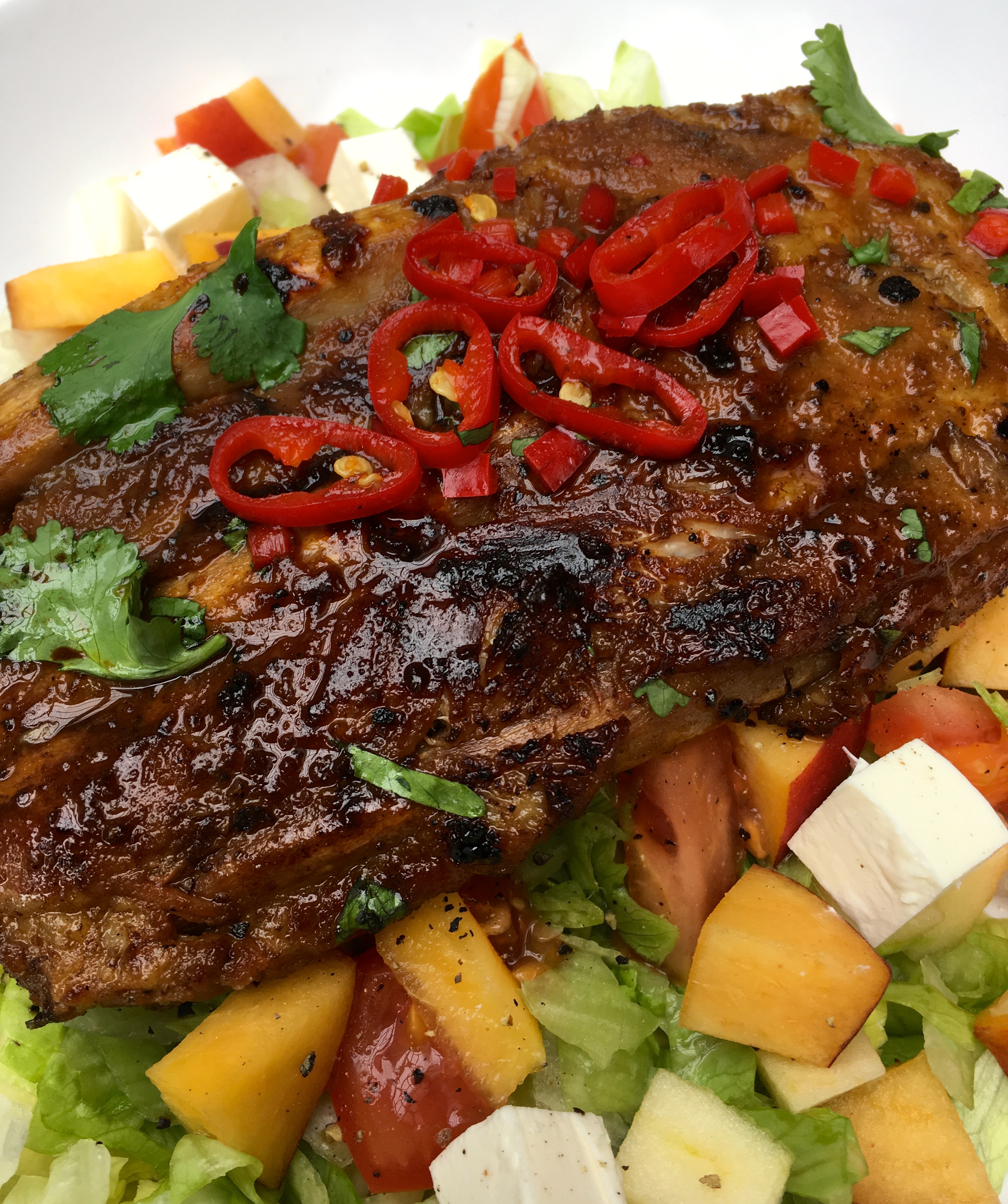 Pääruokana tuolla maukkaalla ja rakkaudella valmistetulla aterialla nautimme Tomi Björckin kuuluisaa karamellisoitua possua. Ihan kuin Farangissa se ei kuitenkaan ollut, vaan Tomi itse oli soveltanut reseptin hieman enemmän kotikeittiöihin sopivaksi, lähinnä kai poistanut ja korvannut kaikkein erikoisimpia ainesosia. Reseptin, joka tuntuisi kuluneen yhden jos toisenkin bloggarin hyppysissä, Aleksi oli napannut Hyvää ruokaa ja annoskateutta -blogista, mutta alkuperäisimmillään se löytyy Björckin kirjasta Huippukokin kotiruokaa – täytyypä muuten napata opus testaukseen.