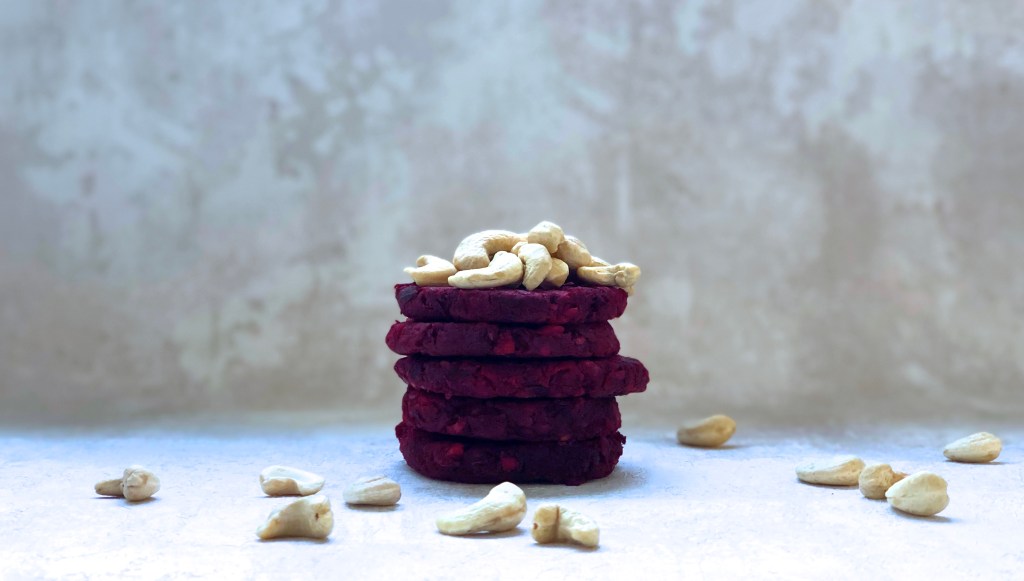 Yksi varastokasvissuosikeistani, punajuuri, näyttelee pääroolia Cafe Engelin klassikkoannoksena tunnetuissa kasvispihveissä. Punajuuripihvit ovat taikinaan lisätyn riisin ansiosta kivan erilaiset, eikä tarjoiluunkaan tarvita krumeluureja. Kurkkumajoneesi, rucola ja balsamico riittävät mainiosti. Seuraavaa reseptiä kannattaa ilman muuta testata – heti kun rosollin jälkeen punajuuriruoka jälleen kiinnostelee.
