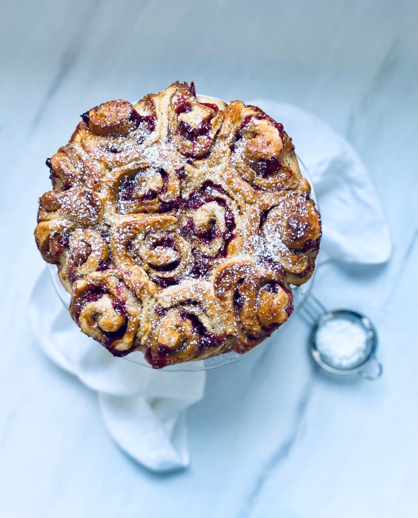 Sulata voi kattilassa tai mikroaaltouunissa. Lämmitä maito kädenlämpöiseksi (37 astetta). Jos käytät kuivahiivaa, maidon suosituslämpötila on 42 astetta. Murenna hiiva maidon joukkoon. Sekoita käsivispilällä, kunnes hiiva on liuennut. Sekoita maitoon sokeri, kardemumma, vaniljasokeri ja suola. Lisää muna käsivispilällä nopeasti sekoittaen. Aloita jauhojen lisääminen. Lisää noin puolet jauhoista ja vatkaa sitten käsivispilällä. Jatka tämän jälkeen jauhojen lisäämistä noin desi kerrallaan ylesikoneella tai kädellä vaivaten. Sekoita hyvissä ajoin joukkoon myös voisula, jotta taikina ei jää rasvaiseksi möykyksi. Voisula on hyvä lisätä siinä vaiheessa, kun jauhoista on lisätty noin kaksi kolmasosaa. Vaivaa taikinaa noin 10 min. kunnes se on kimmoisaa. Peitä taikinakulho liinalla ja kohota lämpimässä paikassa noin 45 min. Itse tapaan nostattaa taikinaa mikroaaltouunissa. Taikinan kohotessa valmista kinuski. Mittaa kuohukerma ja fariinisokeri kattilaan. Kuumenna kiehuvaksi. Keitä kinuskia lieden keskiteholla välillä sekoitellen 15-20 min. Valmis kinuski sakenee nestemäisestä kastikemaiseksi ja tummuu hieman väriltään. Voit myös testata kinuskin tilannetta tiputtamalla pisaran kinuskia jääkylmällä vedellä täytettyyn lasiin. Jatka keittämistä, jos pisara hajoaa veteen pudotettaessa. Mikäli pisara putoaa lasin pohjalle ehjänä, kinuski on valmista. Kaavi kohotettu taikina jauhotetulle pöydälle ja kaulitse ohueksi levyksi (noin 35×70 cm). Levitä päälle kinuski ja ripottele puolukat. Kieritä taikina rullalle pidemmältä sivulta alkaen ja nipistä saumakohta huolellisesti umpeen. Leikkaa rullasta noin 14 palaa. Nosta palat pystyyn leivinpaperilla vuorattuun kakku- tai irtopohjavuokaan. Muista jättää palojen väliin leviämisvaraa. Ihan kaikki palat eivät vuokaan mahdu, mutta ne voi paistaa erikseen. Anna kohota liinalla peitettynä 20-30 min. Voitele kananmunalla ja ripottele pinnalle halutessasi raesokeria. Paista 200-asteisessa uunissa noin 30-40 min. Suojaa pinta foliolla, kun kakku on saanut sopivasti väriä. Koristele valmis ja hieman jäähtynyt kakku tomusokerilla.