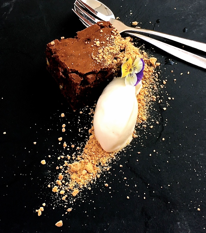 Pääruoista toinen, se lihapuolen edustaja, on tästä ruokaretkestä se oma henkilökohtainen suosikkini. Kolmos3n burgerissa, josta me saamme eteemme hauskat miniversiot, luomu charolaisnaudanpihvi on paistettu juuri sopivan mediumiksi. Pihvin ohella sämpylän sisään on kätketty savustettua porsaan kylkeä, cheddaria, suolakurkkua, majoneesia ja salaatinlehti. Yksinkertaisesti hyvää. On muuten samalla ensimmäinen kerta, kun maistelumenu pitää sisällään burgerin. Ja taas: Listalta olisin valinnut pääruoakseni tämän, ja ollut valintaani aivan varmasti vähintäänkin tyytyväinen.