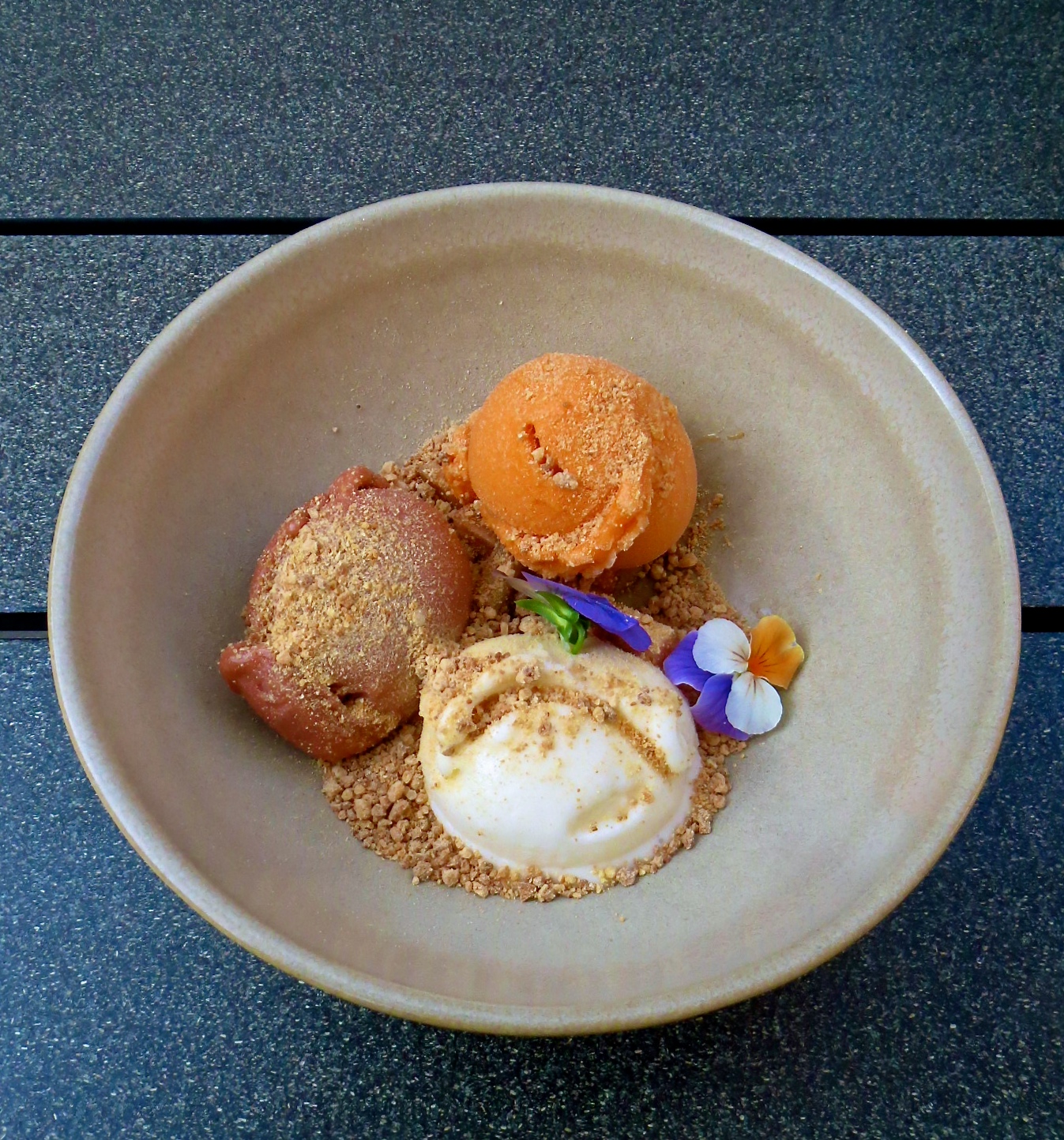 Ennen virallista jälkiruokaa saamme herätellä makeanhimoamme ihastuttavalla tervehdyksellä keittiöstä. Karpalojäädykettä ja suolatoffeeta. Nam ja maiskis, tätä kun olisi saanut kokonaisen annoksen. Varsinainen jälkiruoka, Kolmos3n sekamelska, ei sekään hullumpi ole, mutta tällaisen armottoman sokerihiiren sydäntä tummasuklaamousse ei onnistu kinuskin tavoin viemään. Toki annos on kokonaisuutena hyvä – pidän näistä sekasotkuista, joita itsekin tapaan harrastaa – ja niin ikään erityisen kaunis.