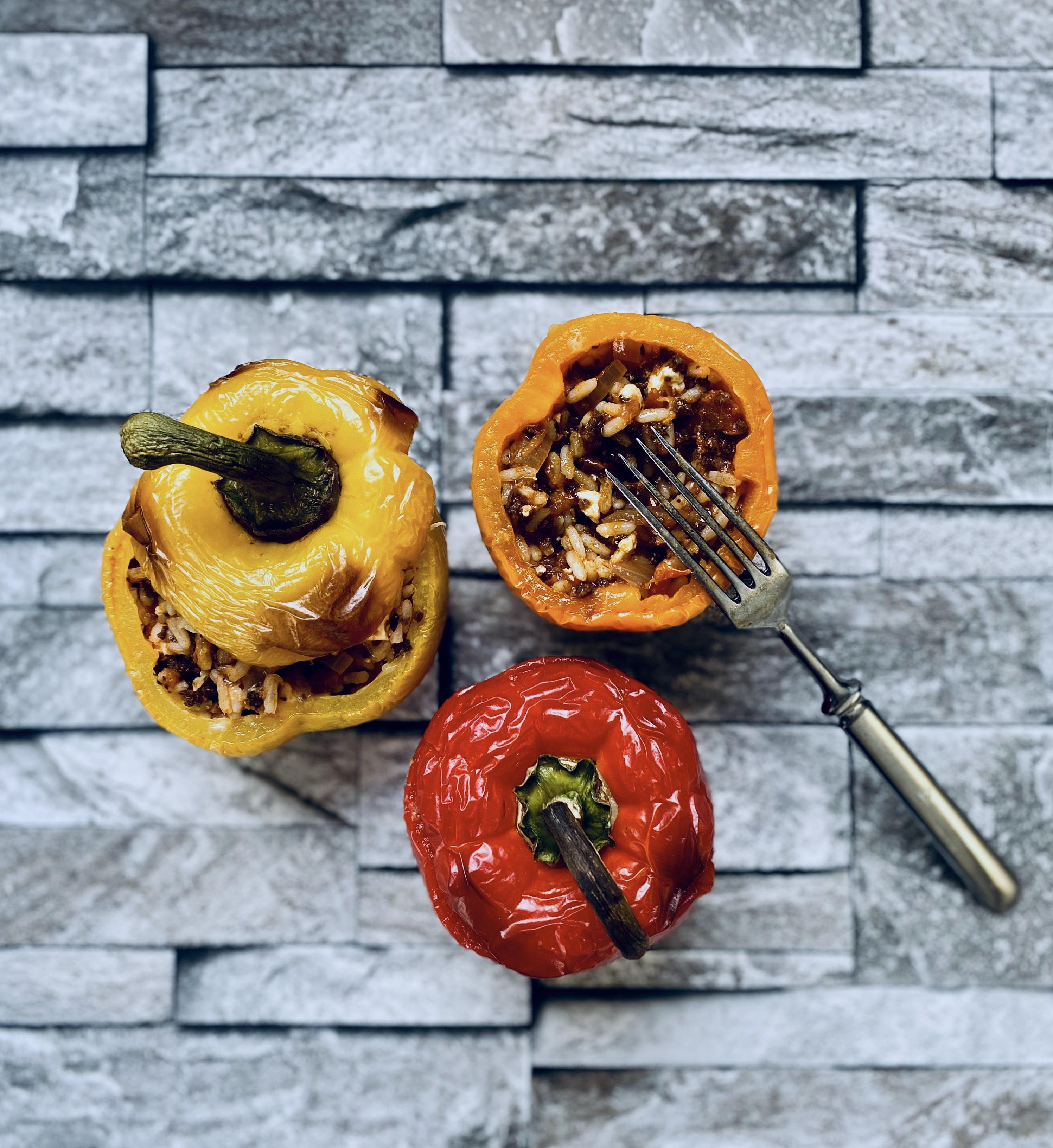 Huom! Täytettä tulee paljon, enkä itse ole koskaan tainnut käyttää sitä kokonaan paprikoiden täyttämiseen, vaan olemme syöneet osan pastan kanssa. Jos kuitenkin käytät koko täytteen ja lisäät näin ollen myös riisiä ja fetaa enemmän, saat annoksesta reilun määrän paprikapurilaisia.