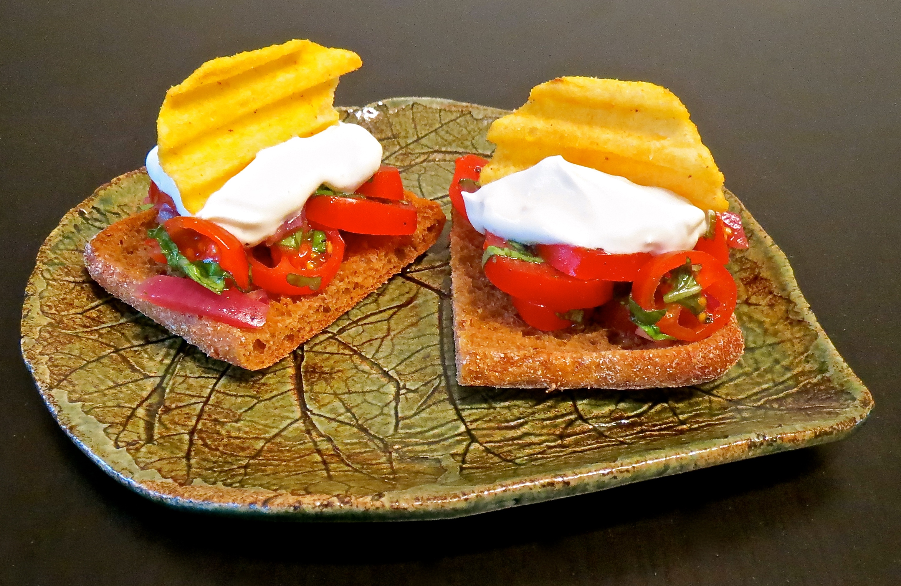 Kokoa annokset laittamalla leiville tomaattisalaattia ja tuorejuustomoussea. Koristele perunalastuin.