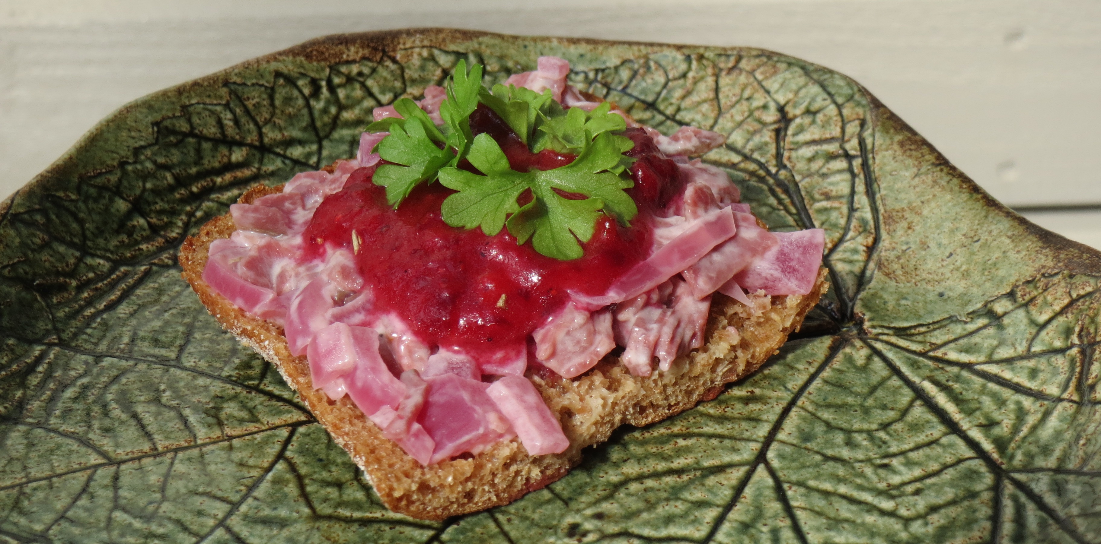 Sekoita keskenään poro, punasipulihilloke/sienet ja ranskankerma. Mausta kevyesti pippurilla.
