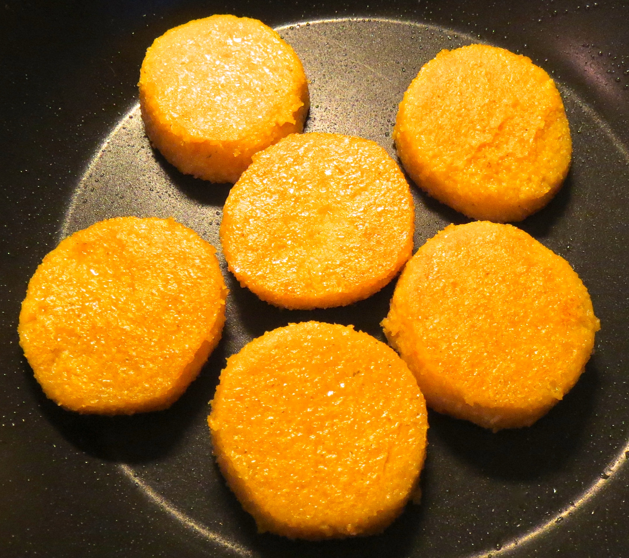 Leikkaa jäähtyneestä polentalevystä annospaloja esimerkiksi lasin avulla ja paista ne kuumalla pannulla oliiviöljyssä.