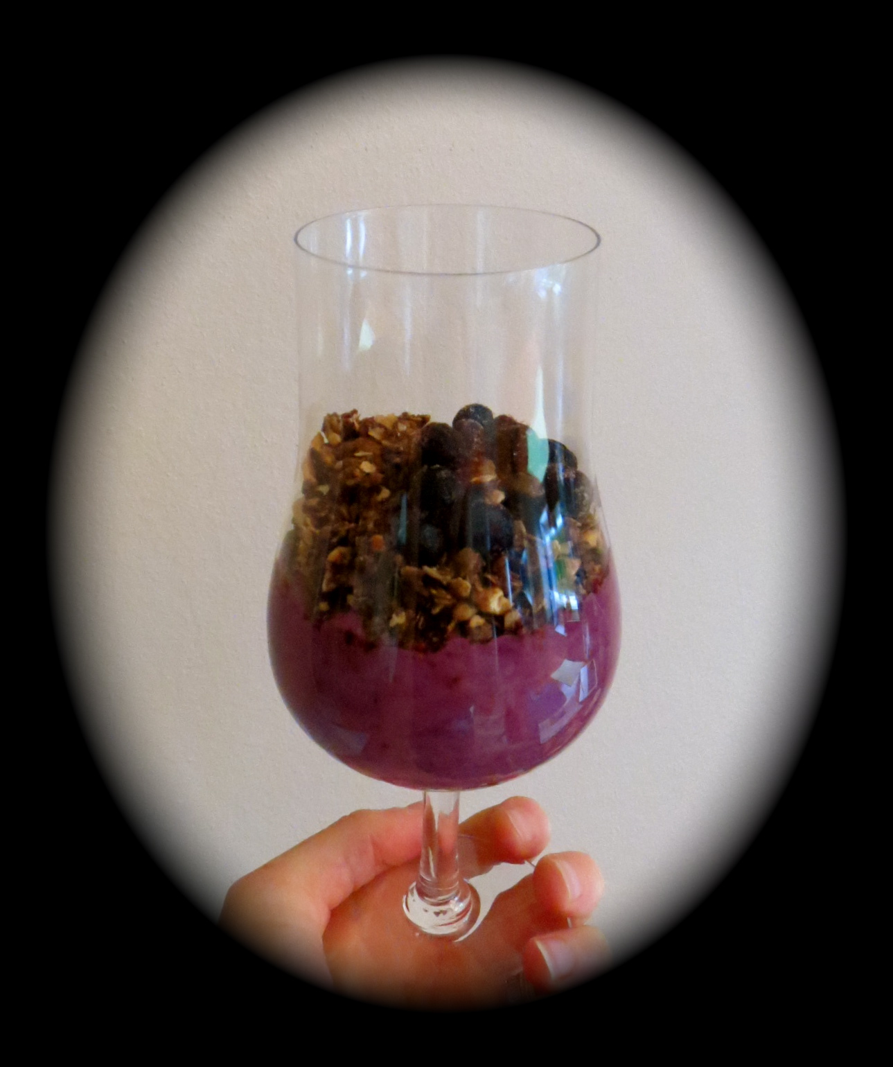Mittaa lasiin kerroksittain ensin kauraa, sitten mustikkarahkaa ja lopuksi vielä aimo kerros kauraa.