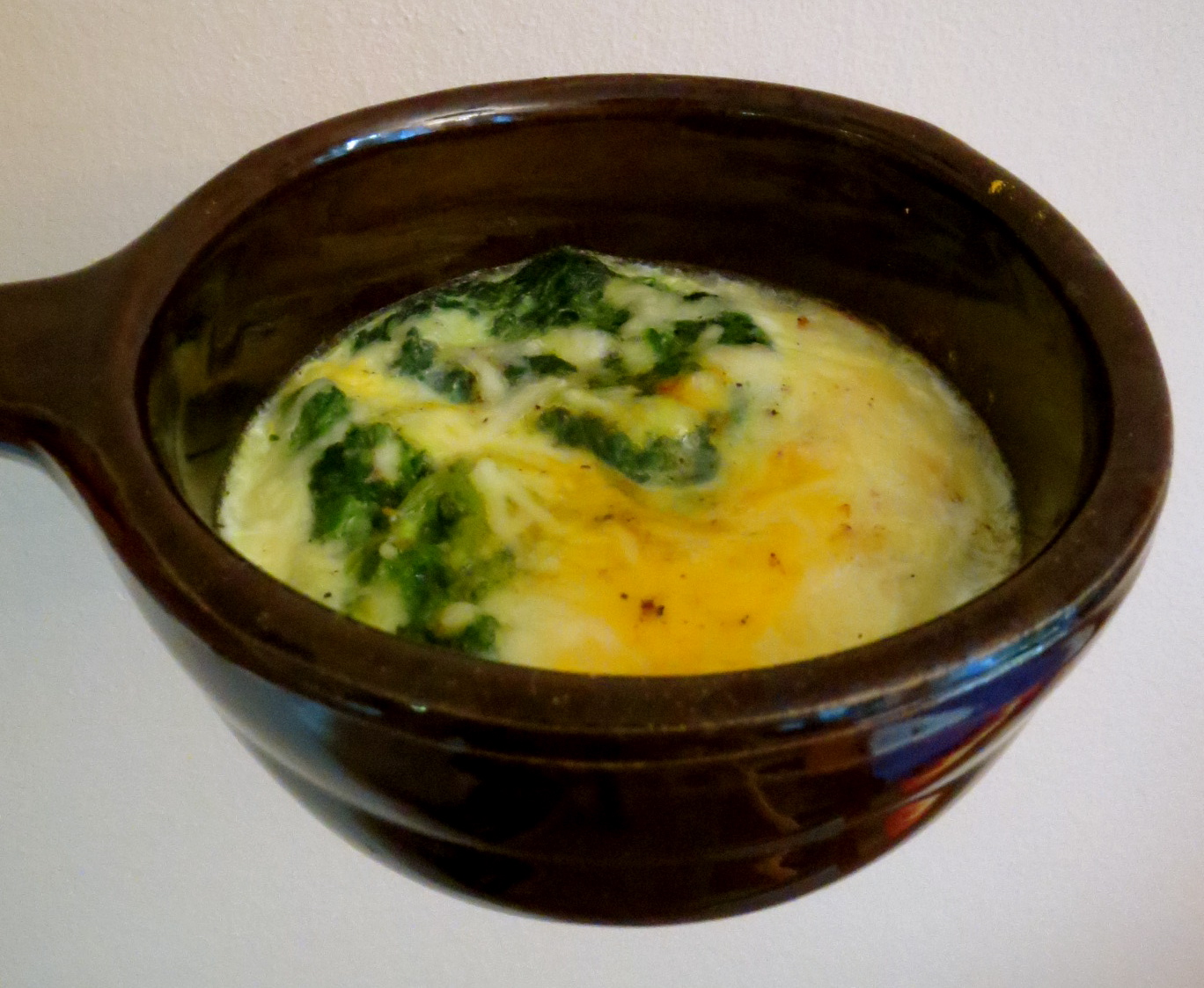 Laita pinaattikuutiot annosvuoan pohjalle. Riko päälle yksi kananmuna. Lorauta joukkoon kermaa tai maitoa. Ripottele päälle hieman muskottipähkinää, kurkumaa ja mustapippuria. Lisää myös suolaa makusi mukaan. Kuorruta paistos juustoraasteella.