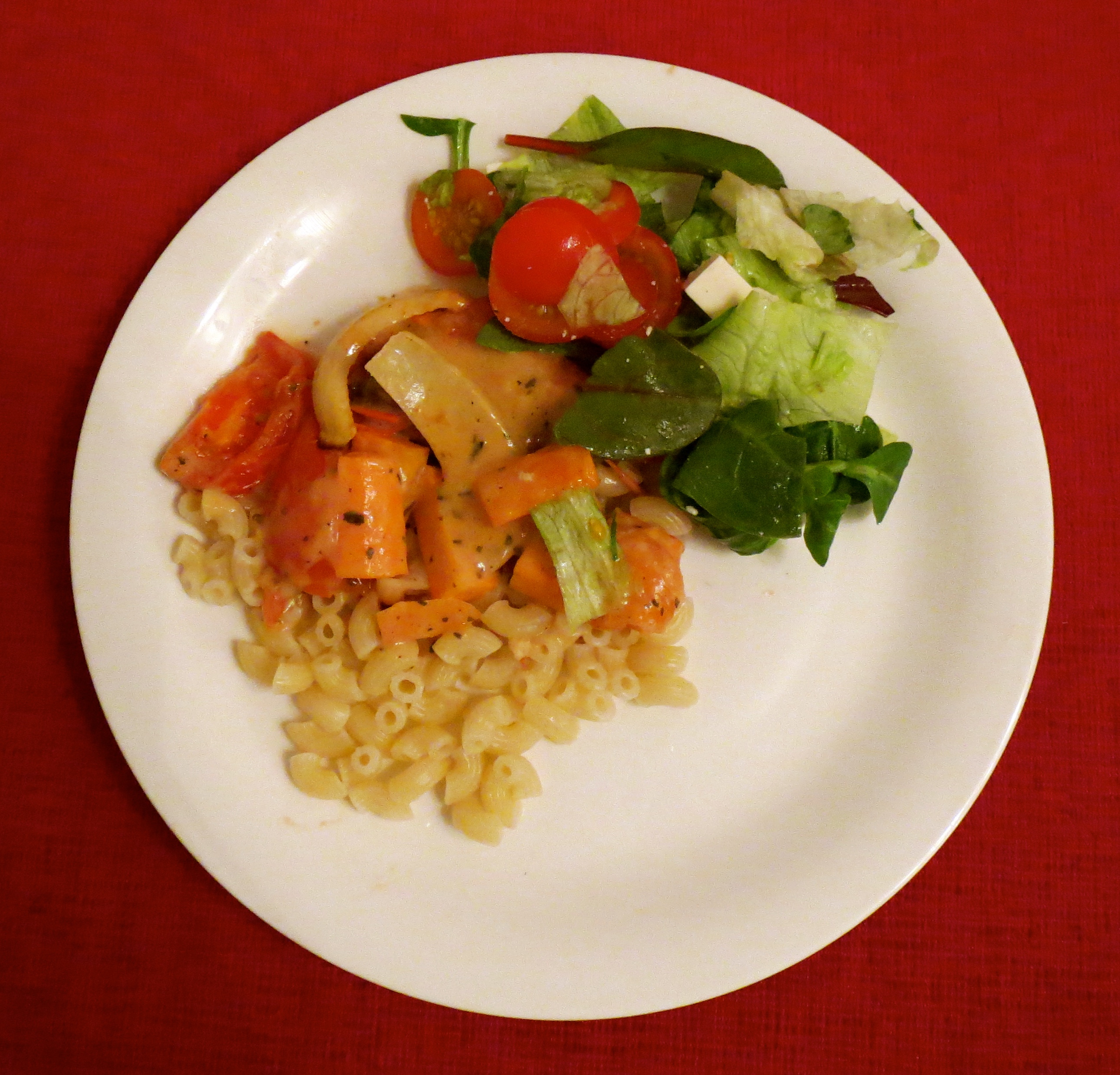 Ja vielä juustomakaronista: Emme suosittele valmistamaan tätä pääruoaksi, vaikka Amerikan keittokirja, josta tämän ohjeen löysin, sitä koko perheen illallisruokasuosiksi tituleeraakin. On tämä ”mac ’n’ cheese” nimittäin sen verran tuhtia tavaraa, että ihmettelen, jos joku tuntee olonsa hyväksi nautittuaan sitä kokonaisen aterian verran. Tosin taitavat nuo tuolla rapakon toisella puolella melko useasti näin tehdä (siitä kuuluisasta valmispussista käsin)… Mainittuun Amerikan keittokirjaan tulen lähitulevaisuudessa palaamaan tarkemmin.