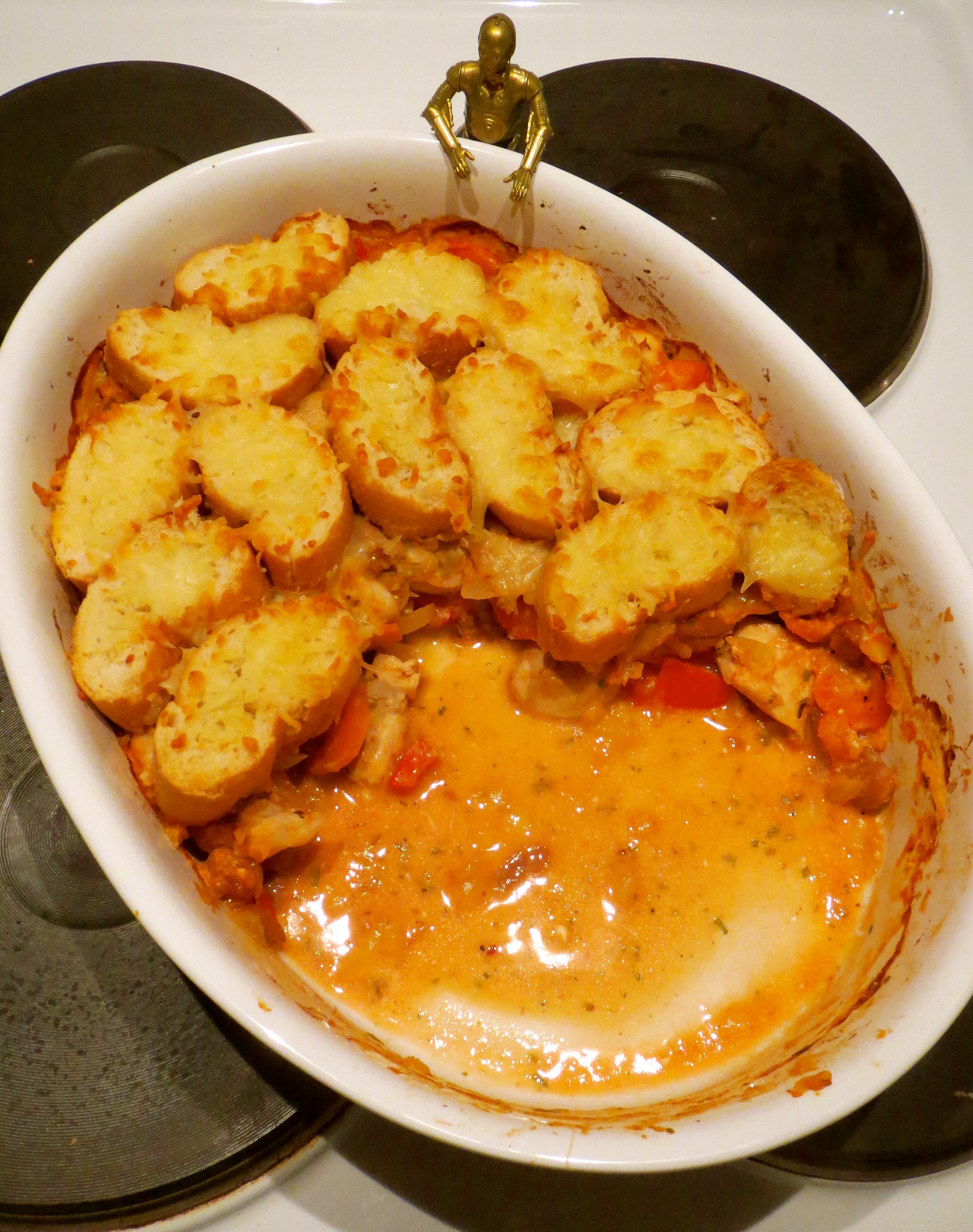 Kuusiviikkoisemme kanssa valmistimme ensimmäisen yhdessä vietetyn päivämme kunniaksi ”Kanaa Igorin tapaan”. Resepti, jonka Glorian Ruoka ja Viini -lehti valitsi vuoden 2014 hauskimmaksi blogiruoaksi on peräisin Peggyn pieni punainen keittiö -blogista. Koska lähtökohtani tämän ruoan valmistukseen oli jälleen kerran hyödyntää ”ruokaa rippeistä” -ideologiaani – raivaten näin samalla tilaa pakastimeen tulevan omenahillokauden varalle – sovelsin ohjeistusta omiin ainesosavarastoihini sopivaksi.