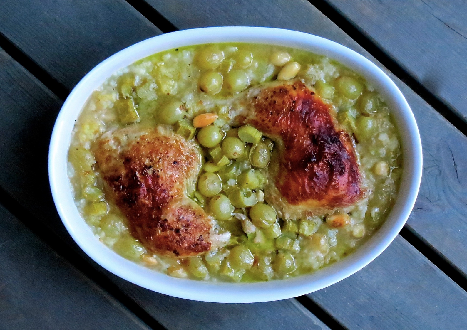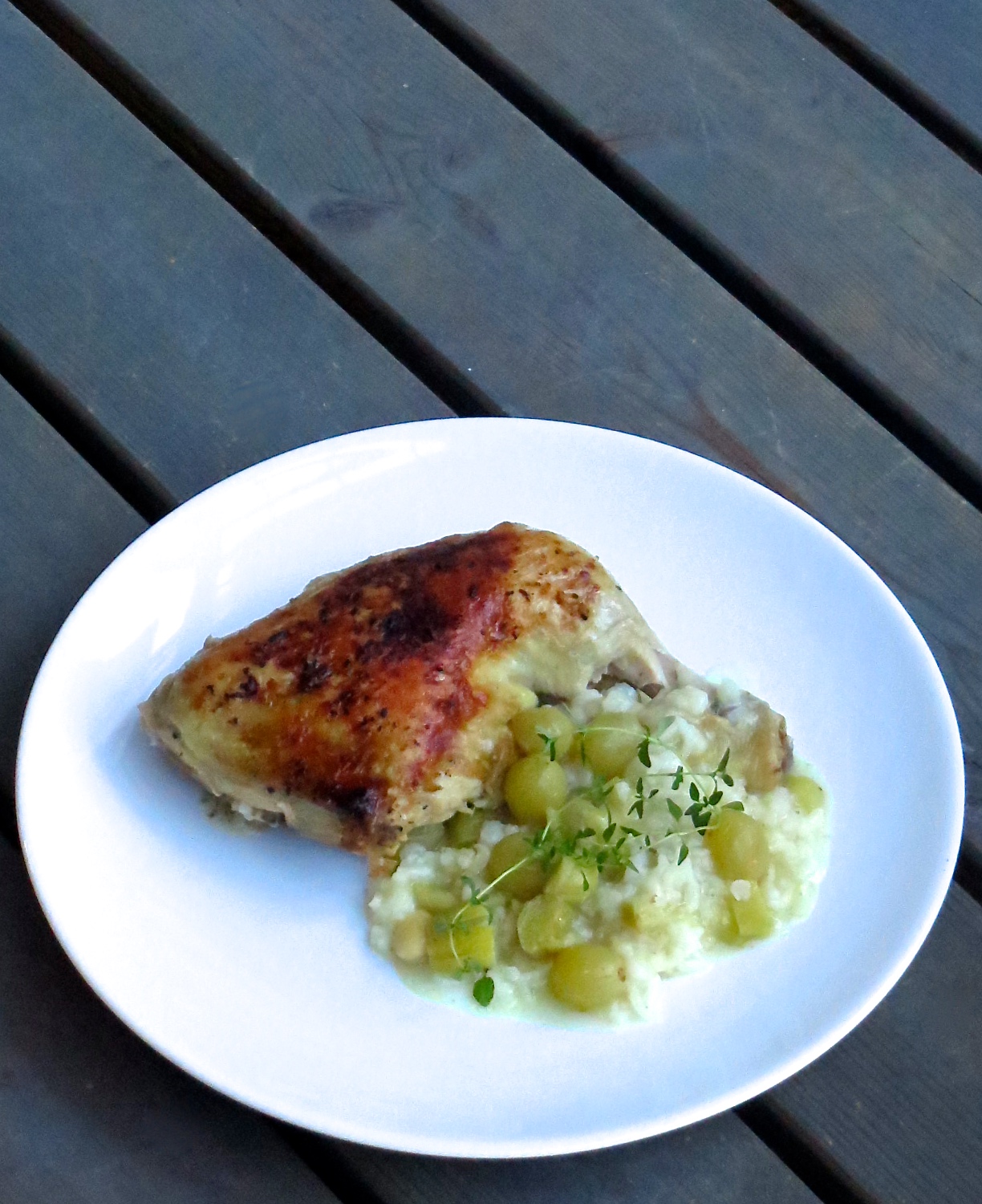 Pääruokareseptin sen sijaan vakoilin ihastuttavasta Kaikki äitini reseptit -blogista ja täytyykin todeta, että tällä ohjeistuksella broilerin koipireidet makoisine nahkoineen muuttuivat vielä tavallistakin paremmiksi. Muuttelin ainesosaluetteloa himpun verran korvaten punaiset viinirypäleet raparperilla sekä kuivan Rieslingin varastostamme löytyneellä alkoholittomalla valkoviinillä. Raparperi ja rypäleet sopivat mallikkaasti yhteen ja uskon, että korvikeviinimmekin oli tarkoitukseensa ihan passeli. Ainoa kohta, jonka ohjeesta muuttaisin poistamalla ne kokonaan ovat mantelit. Ne tekivät muuten raikkaaseen risottoon paikka paikoin hiukan tunkkaisen maun. Ja vielä viinirypäleistä; kuten reseptin laatijakin toteaa, uunissa paahdetut rypäleet toden totta maistuvat broilerin kanssa vähintäänkin ihanilta. Muutenkin ajattelin vastaisuudessa lisätä niitä risottoihin.