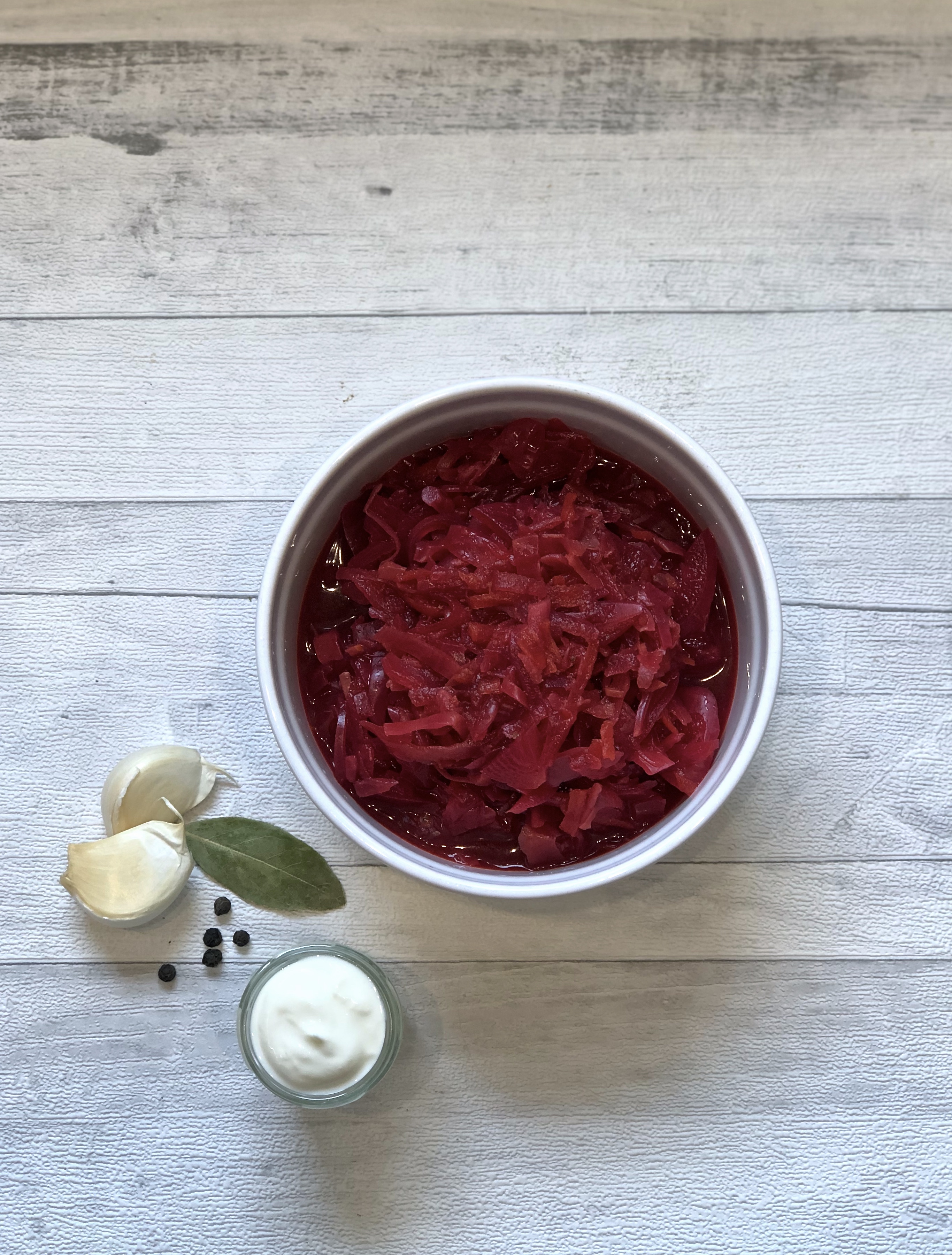 Kuori punajuuret, porkkanat ja juuriselleri. Raasta raastimen karkealla terällä. Leikkaa kaali ja kuoritut sipulit suikaleiksi. Kuori ja hienonna valkosipulin kynnet.