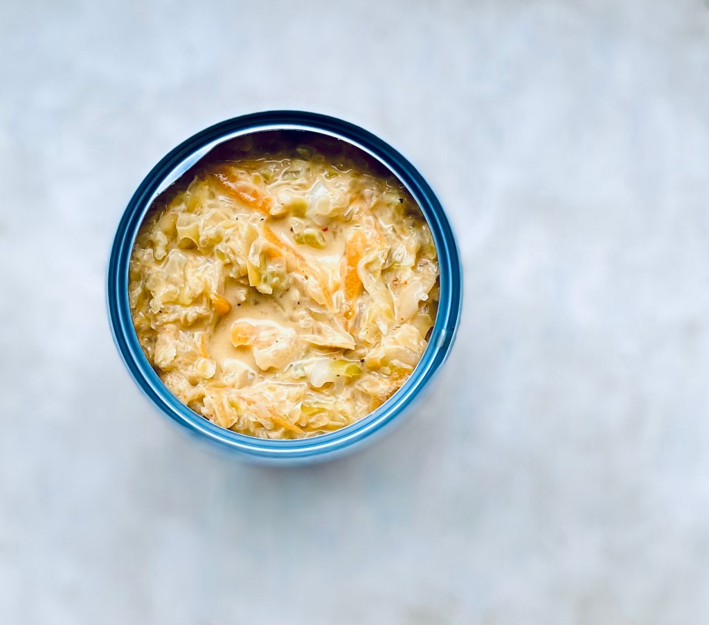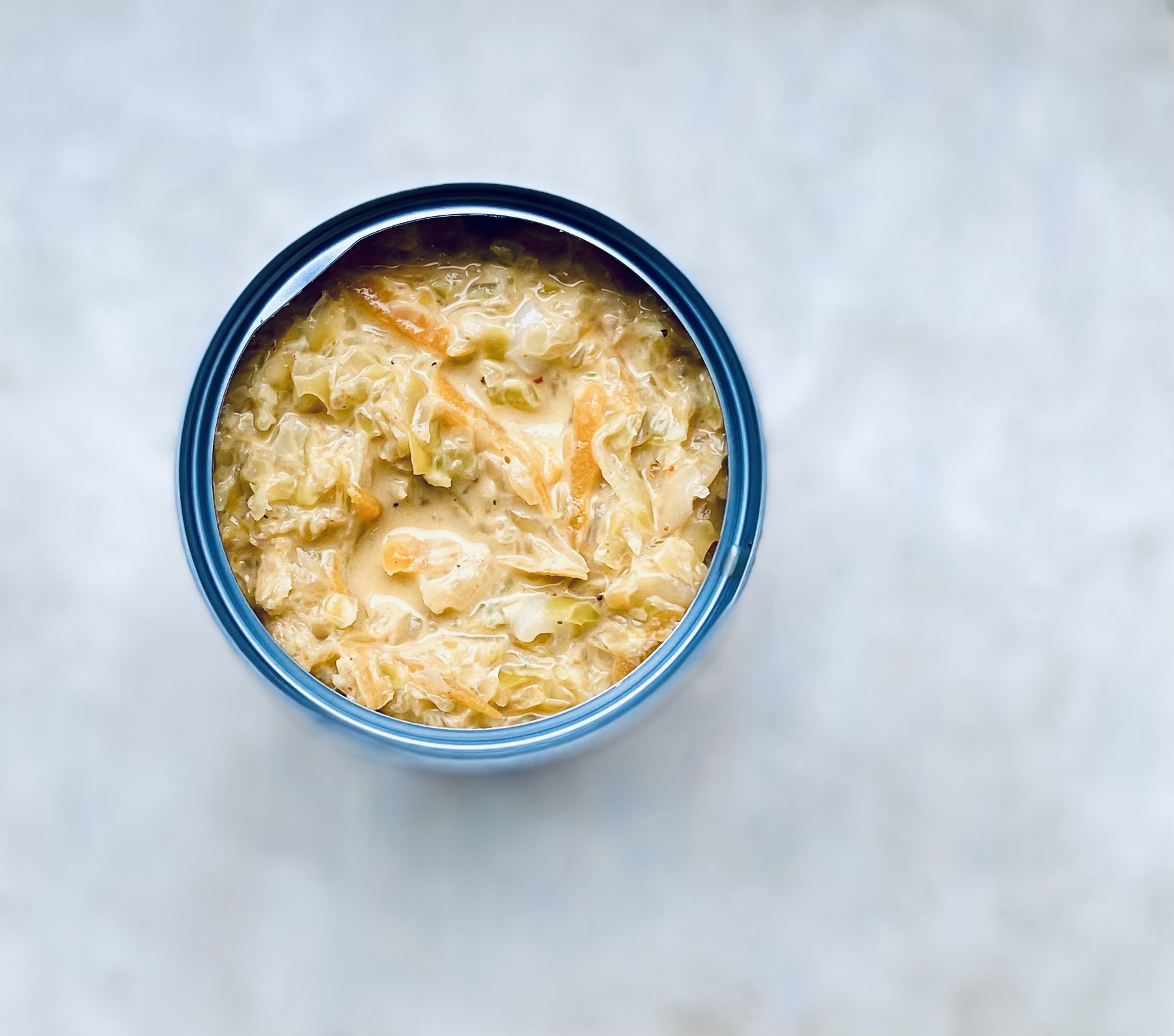 0,5 dl + 1 rkl rypsiöljyä 2 dl soijarouhetta 2 dl vettä 2 rkl soijakastiketta 1 tl savupaprikaa 1 kg varhais-/valkokaalia (Huomio! Valkokaalia käyttäessäsi ruoan kypsymisaika on pidempi.) 1 sipuli 3 valkosipulinkynttä 1 dl maustekurkkuviipaleita 140 g tomaattipyreetä 1 tl meiramia 1 tl suolaa 0,5 tl mustapippuria 1 tl tummaa siirappia 2,5 dl vettä 2 dl kaurakermaa