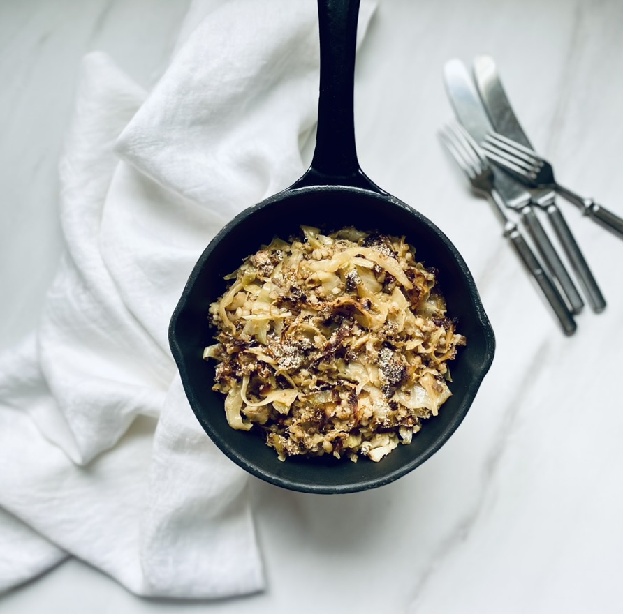 Suikaloi kaali noin puolen senttimetrin suikaleiksi ja paista pannulla muutamassa erässä, kunnes se painuu hieman kasaan. Voit lisätä pannulle myös pienen tilkan vettä.