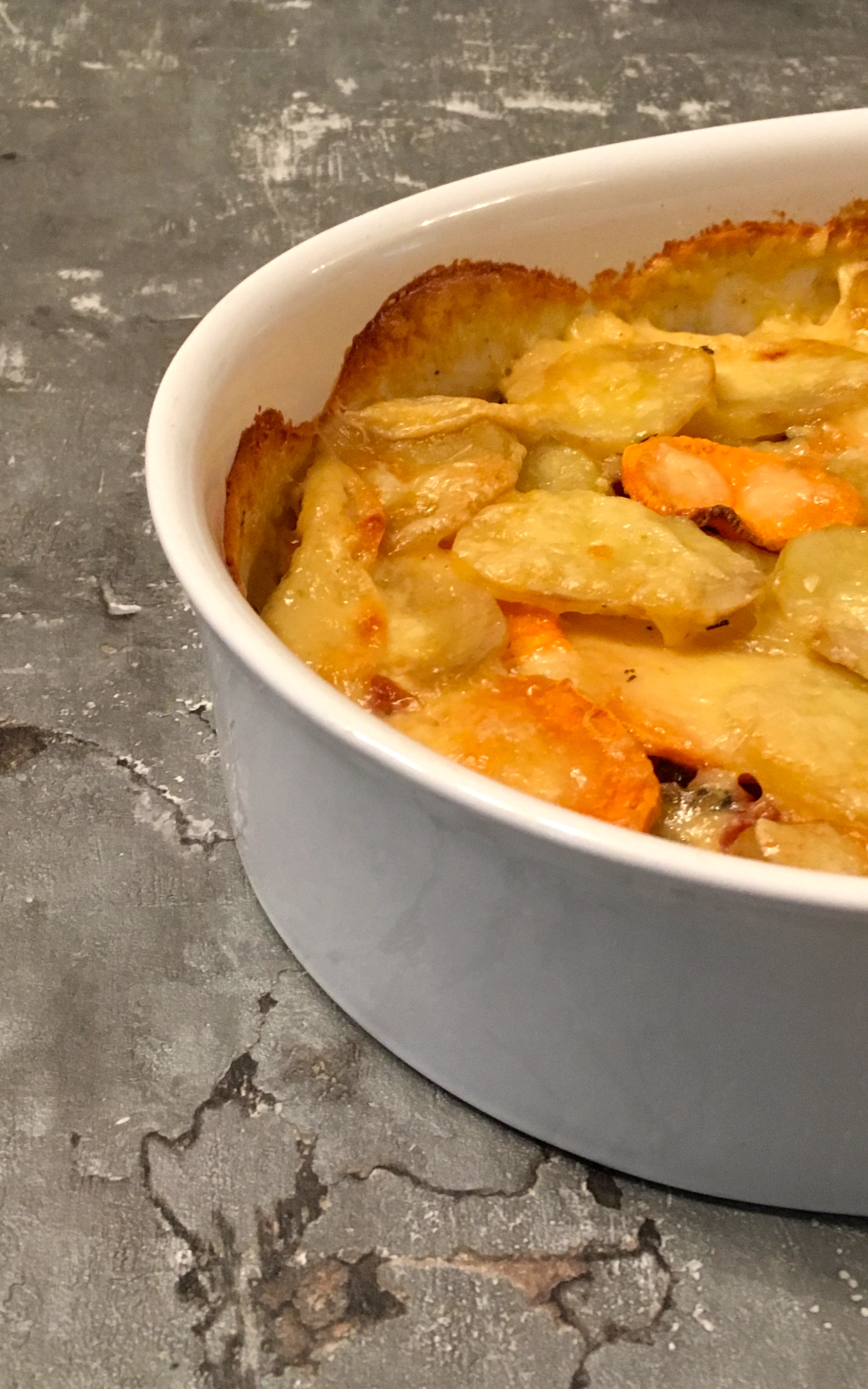 Laita kasviset uunivuokaan, mausta suolalla ja sitruunamehulla. Kaada päälle valkoviiniä ja kermaa.