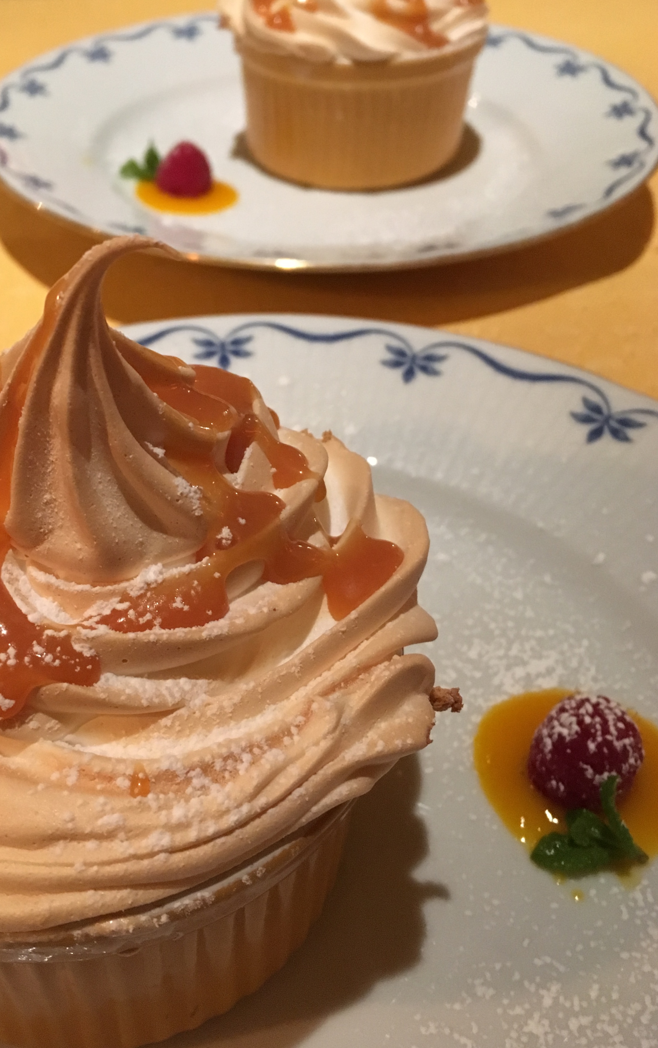 Jälkiruoaksi valikoimme molemmat uunijäätelöä Malakov (9,80€). Annos on jättihyvä suklaakakkupohjineen ja marenkeineen. Kuoren pinnalla vielä kruunuksi kinuskikastiketta. Nam! Kyytipojaksi jälkiruoalle tilaan teetä venäläiseen tapaan hunajan ja vadelmahillon kera (3,50€).
